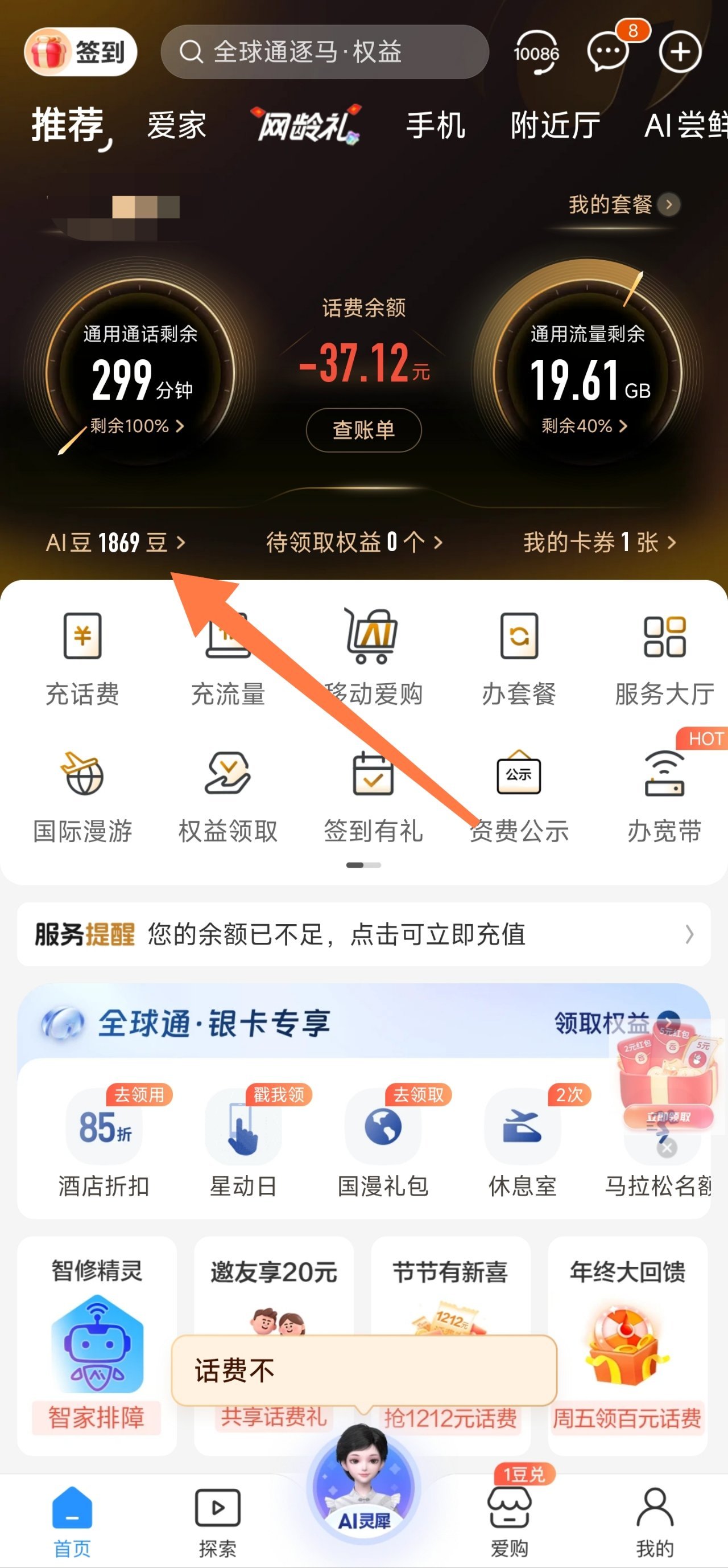 1.打開手機端中國移動營業廳後通常在首頁就有當前手機號持有的AI豆數量,直接點擊數量可進入積分商城的入口。