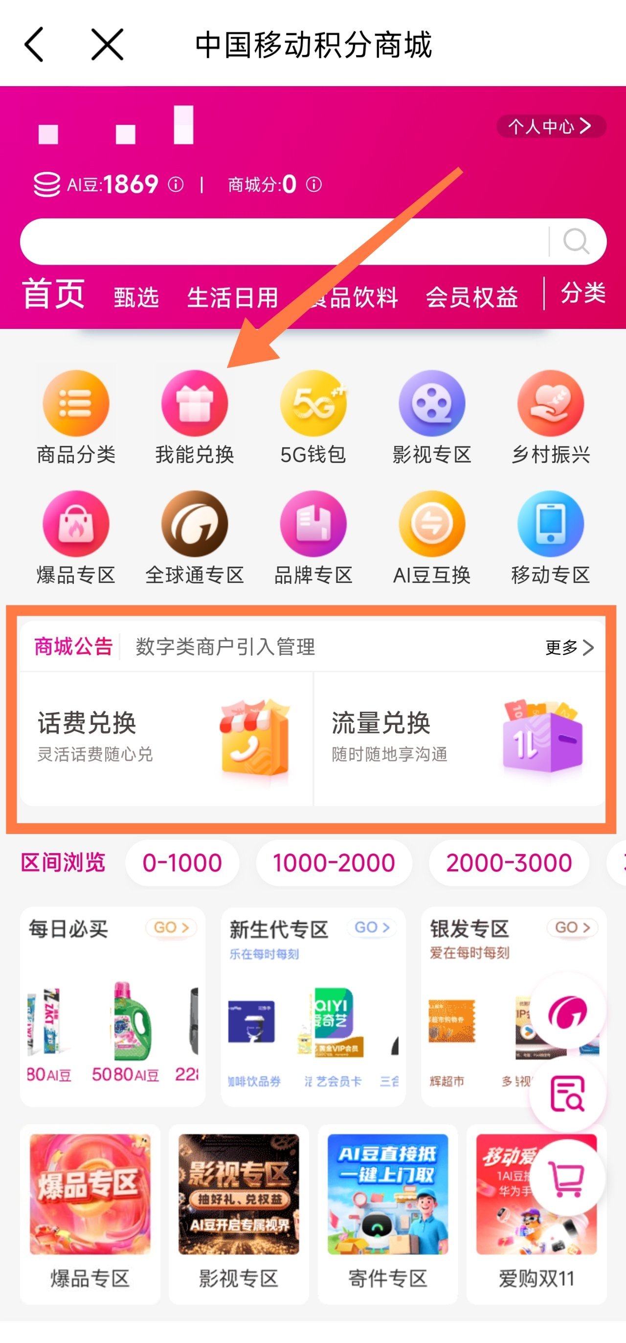 1.兌換話費最低需要500AI豆,實物的兌換門檻會更多,下面以靠下方的積分商城繼續演示。