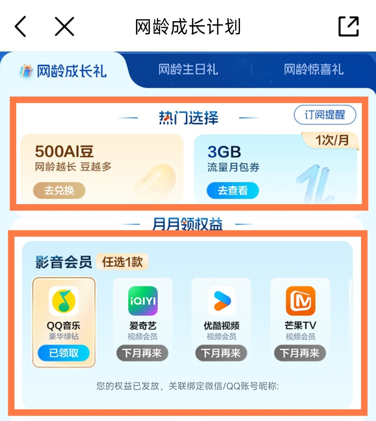 2.手機號滿足一定入網時長可最高領取500AI豆、一些影視平臺的會員和流量等。