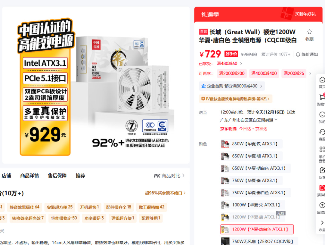 15 日消息,長城推出了一款全模組電源新品“華夏・唐”,其採用白色外觀,具備中國質量認證中心認證 CQCIII 級的“白金級”能效 92%+,售價爲 789 元,領 60 元券後到手價 729 元。
