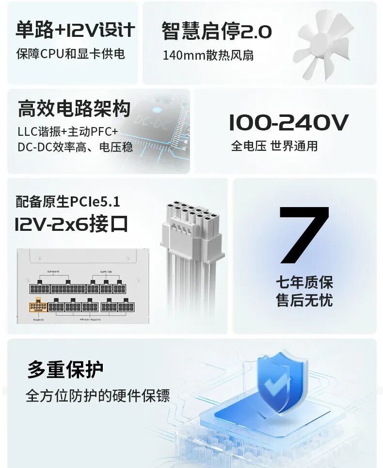 該電源支持 ATX 3.1 標準,全面支持 PCIe 5.1,可承受 2 倍整機瞬時功耗和 3 倍顯卡瞬時功耗的峯值;配備原生 PCIe5.1 12V 2*6 接口,無需轉接,支持“新一代高端顯卡”。其支持 100V-240V 電網,還可適配電壓不穩定區域。