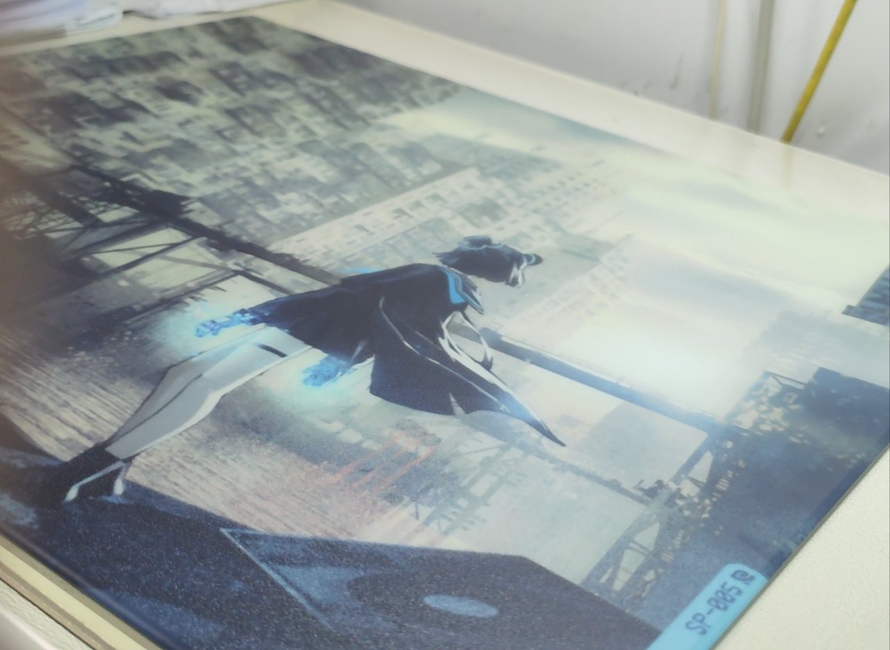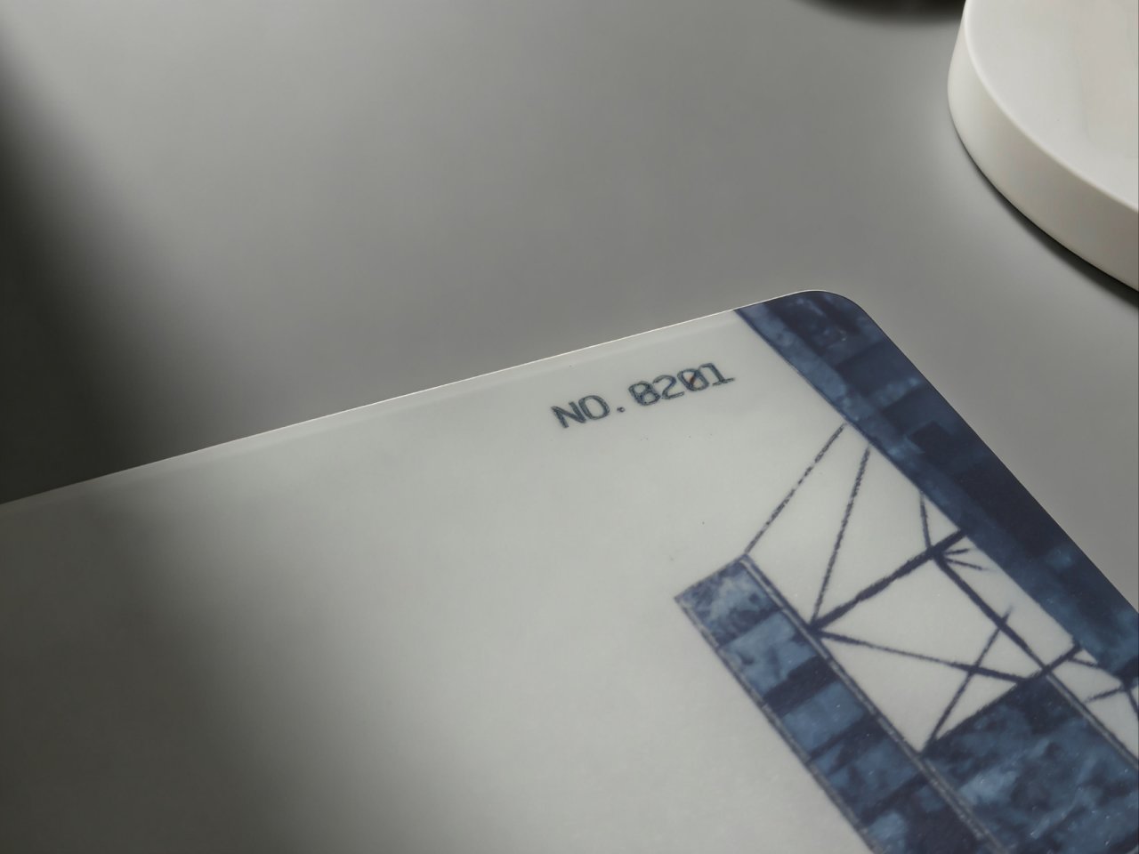 漸變的低飽和夢幻畫風與玻璃材質的質感在這張玻璃墊上提現的淋漓盡致,少女的背影和似乎已經荒廢的城市也是形成強烈的反差