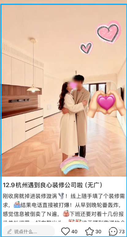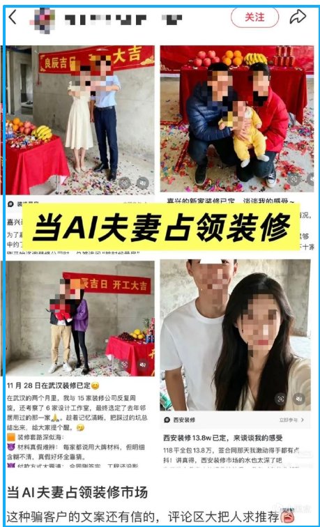 社交平台上的 “完美装修夫妻” 竟藏着猫腻?近期,不少网友在某社交平台刷到的装修避坑笔记引发热议,不同城市、不同账号发布的内容里,居然出现了同一对 “夫妻”,而这些看似真实的分享,实则是 AI 生成的引流文案。