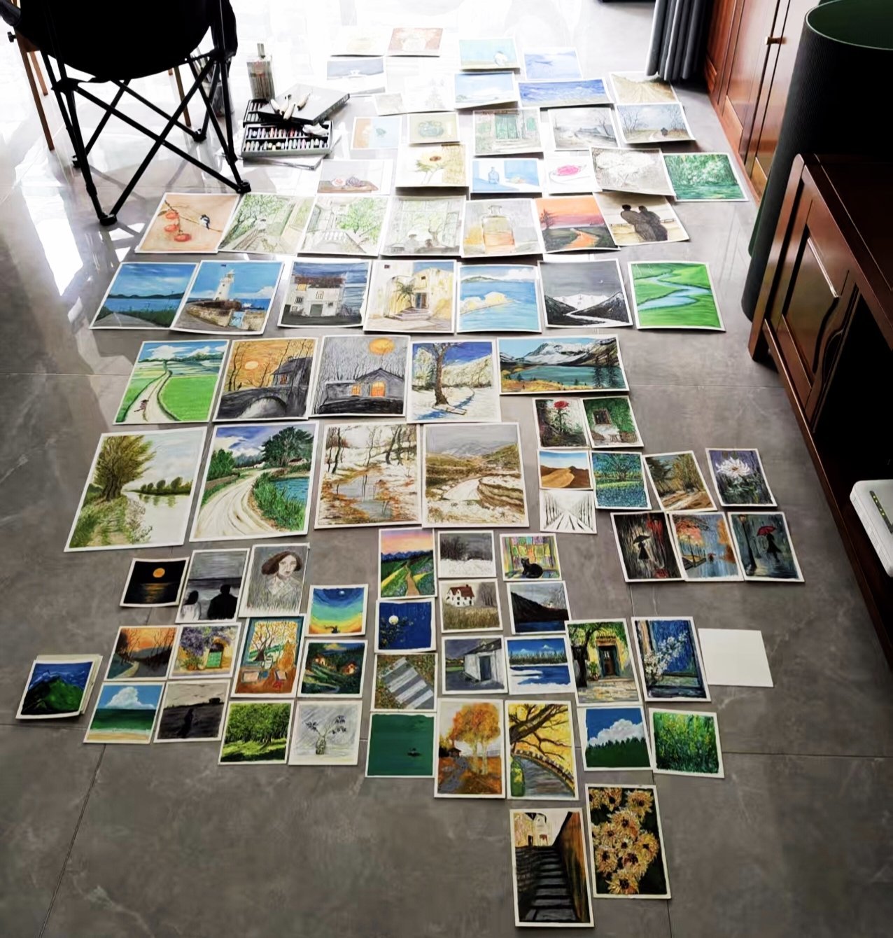 画架上的水彩纸,还是厚厚的一塌,调色盘上的颜料,也快干裂成了地图上的纹理。阳台上的花依然开着,但修剪的很是潦草。