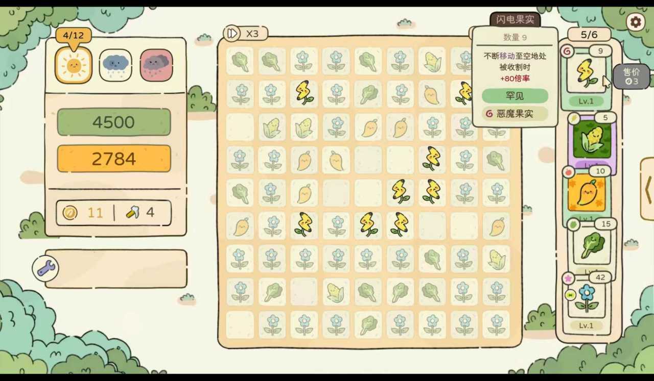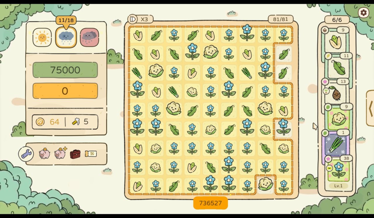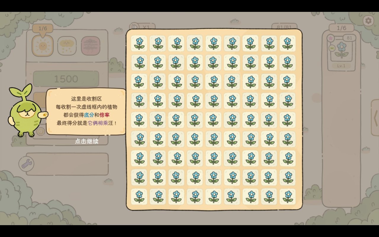 “算是个蛮休闲的类肉鸽策略卡牌小游戏吧,你有固定的收割次数,要在9x9的田里收割植物。有点小时候咱俩一起玩的消消乐那味。”