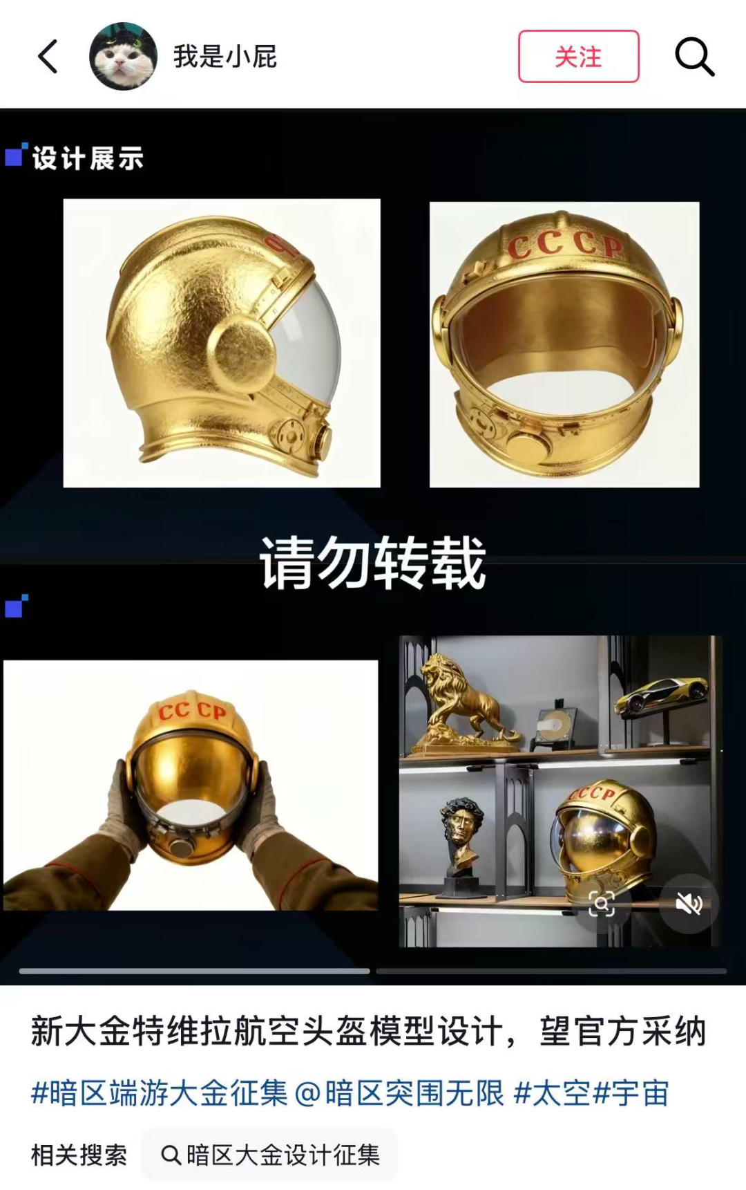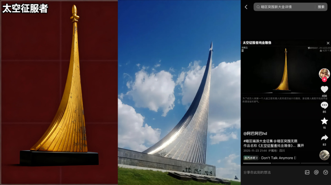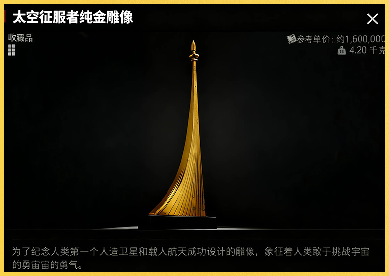 這項設計是坐落於莫斯科的“太空征服者”雕像的微縮模型版本,原雕像修建於1964年,以慶祝蘇聯人在太空探索方面的成就。它紀念着人類突破引力的每一次嘗試,先鋒用純金材質賦予雕像大金的特質,既貼合卡莫納的核心設定,又讓雕像成爲勇氣的載體,創意極具感染力。