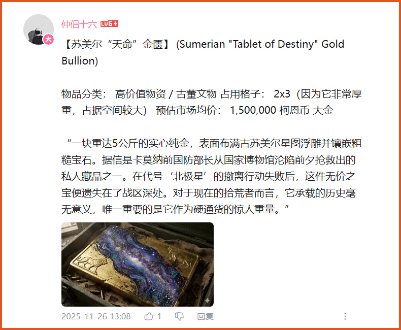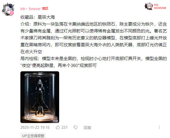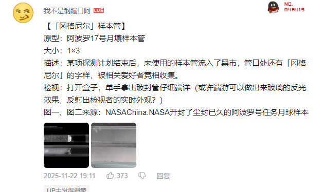 其中裝有阿波羅17號月壤樣本的特殊容器,管口處還有「岡格尼爾」的字樣,這位先鋒的設計嚴謹而又剋制,巧妙地將登月曆史與卡莫納背景故事中”岡格尼爾計劃“的設定相結合,體現出對科學探索的冷靜致敬,好評!