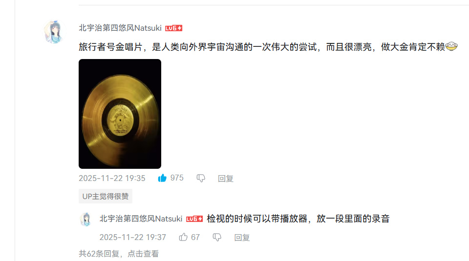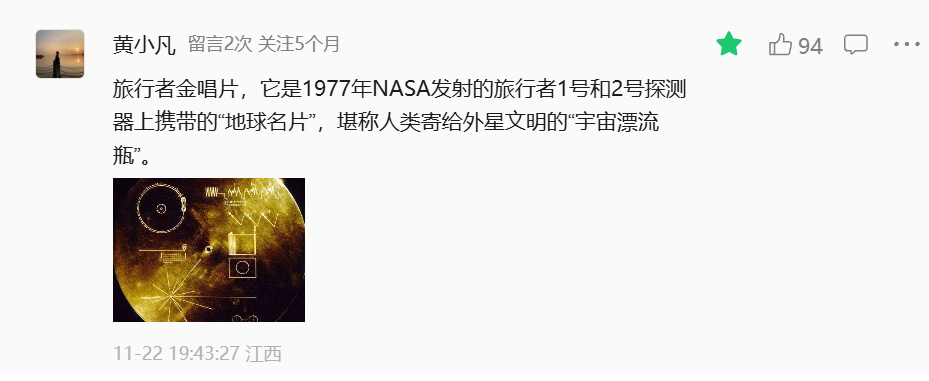 這張唱片或許也是現實中最能代表“探索宇宙”的浪漫物件了,其中包含115張圖像、55種語言問候、地球自然聲效及27首全球音樂作品,一定程度上,它正是人類文明的結晶,1977年,NASA將這張鍍金銅質唱片分別搭載於旅行者2號、1號探測器上,承載着我們對於未知最溫柔的問候。