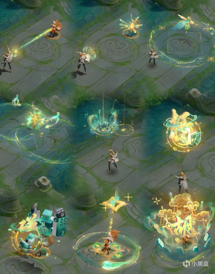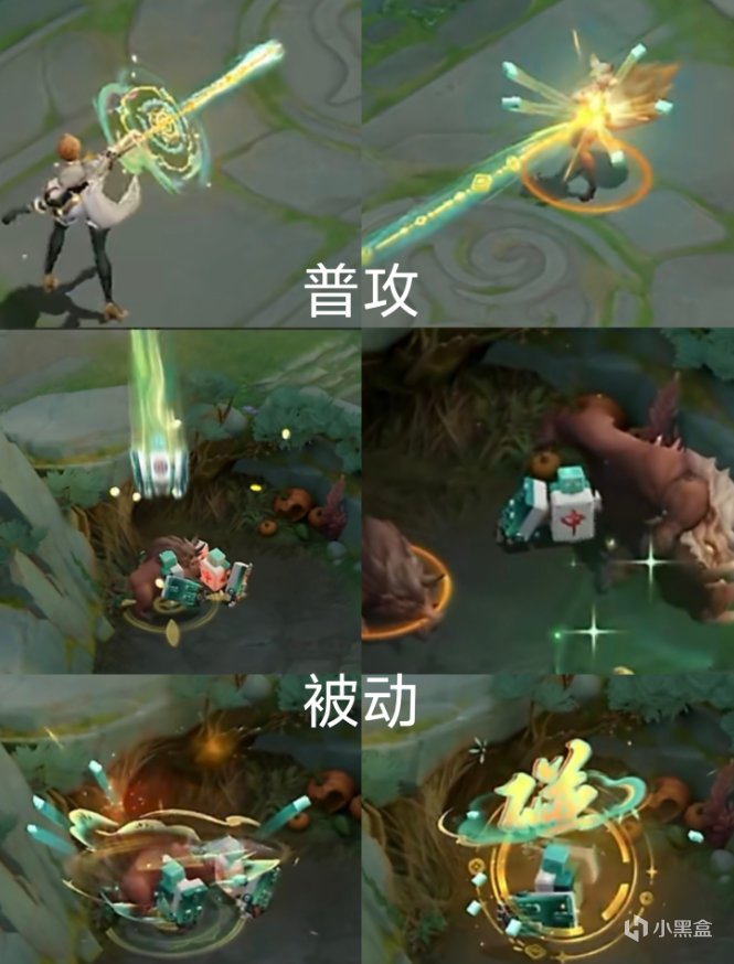 二技能释放后会出现一筒花纹,两个拖曳青云的麻将机关人落下,伴随彩色粒子爆炸。被动技能更具趣味,击杀目标召唤的麻将机关人可合体升级,升级时会跳出 “碰 / 杠” 字样和金色铜钱特效。