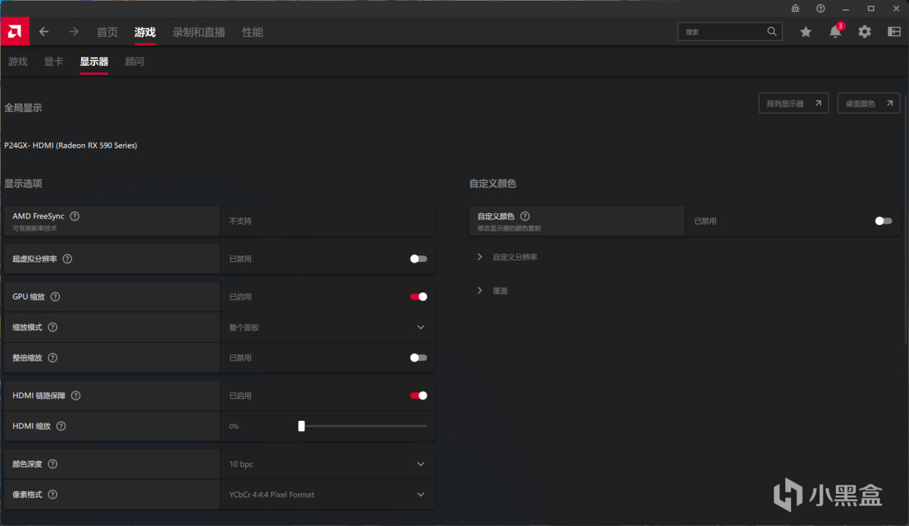 10位像素格式【禁用】:显示器是10位像素格可以打开,为兼容的显示器和OpenGL程序提供缓冲区支持与HDR显示功能不兼容。
