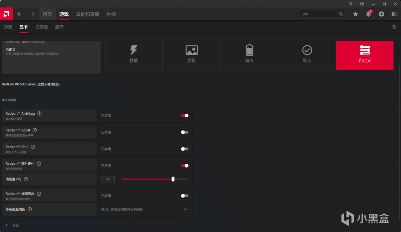 显卡三种模式预设一键切换“性能”、“质量”、HYPR-RX Eco(节能),支持“自定义”。