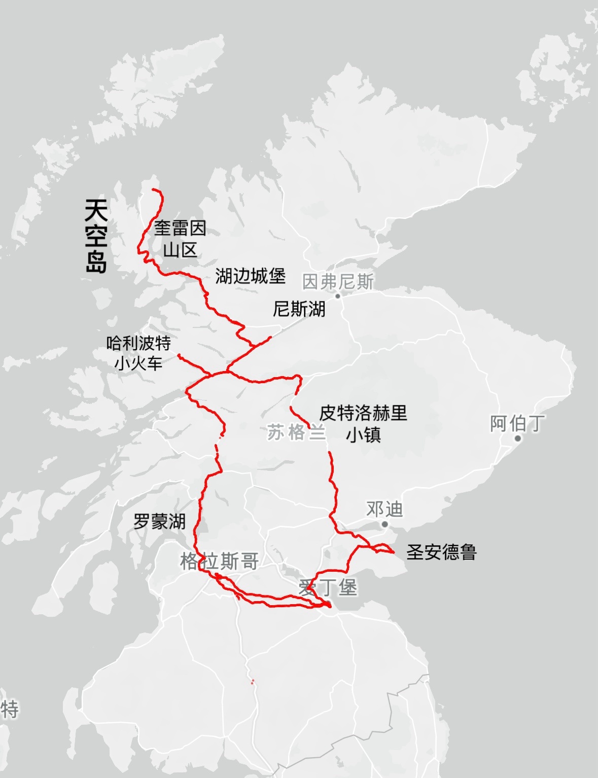 曼彻斯特 → 湖区几个小镇(Windermere) → 格拉斯哥 → 爱丁堡 → 苏格兰高地(尼斯湖、天空岛周边)→ 约克 → 剑桥 → 牛津 → 伦敦