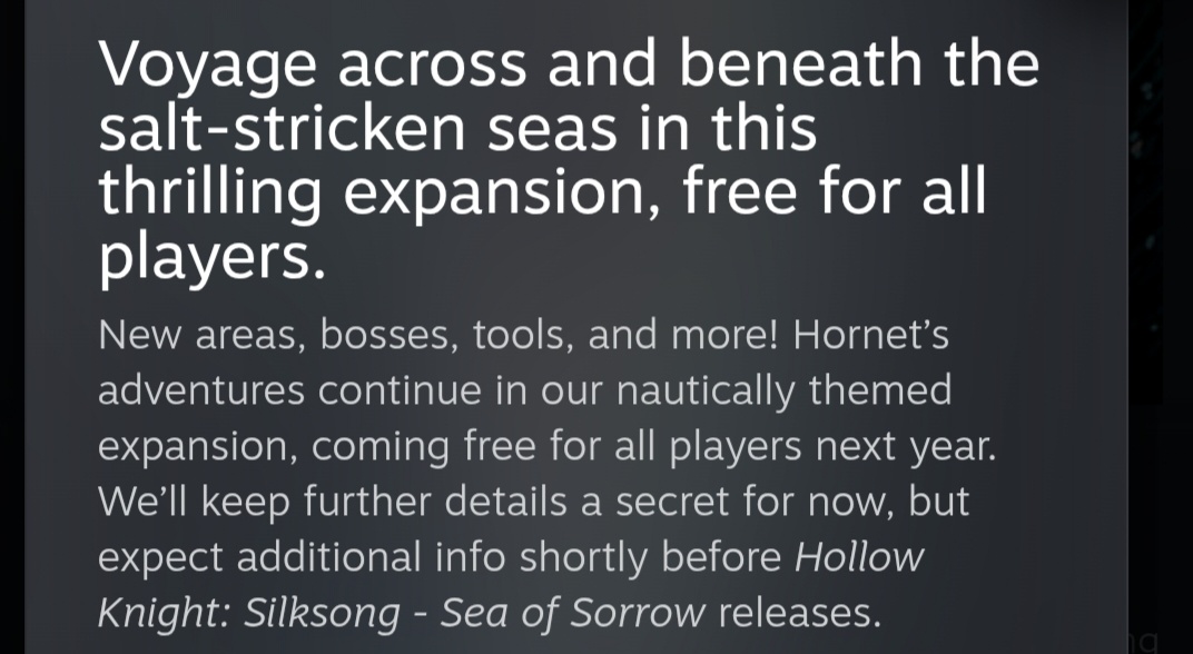 《空洞骑士:丝之歌》「悲恸之海(Sea of Sorrow)」拓展包将于2026年推出,免费向所有玩家开放,预计为游戏带来新区域、新Boss、新工具等内容。