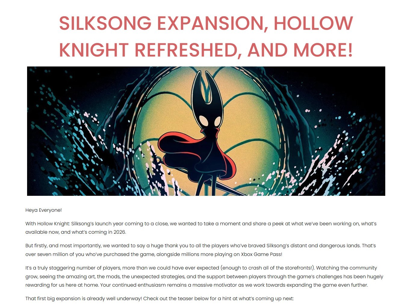 今日,Team Cherry(樱桃工作室)官方宣布,《空洞骑士:丝之歌》将于2026年推出免费DLC。