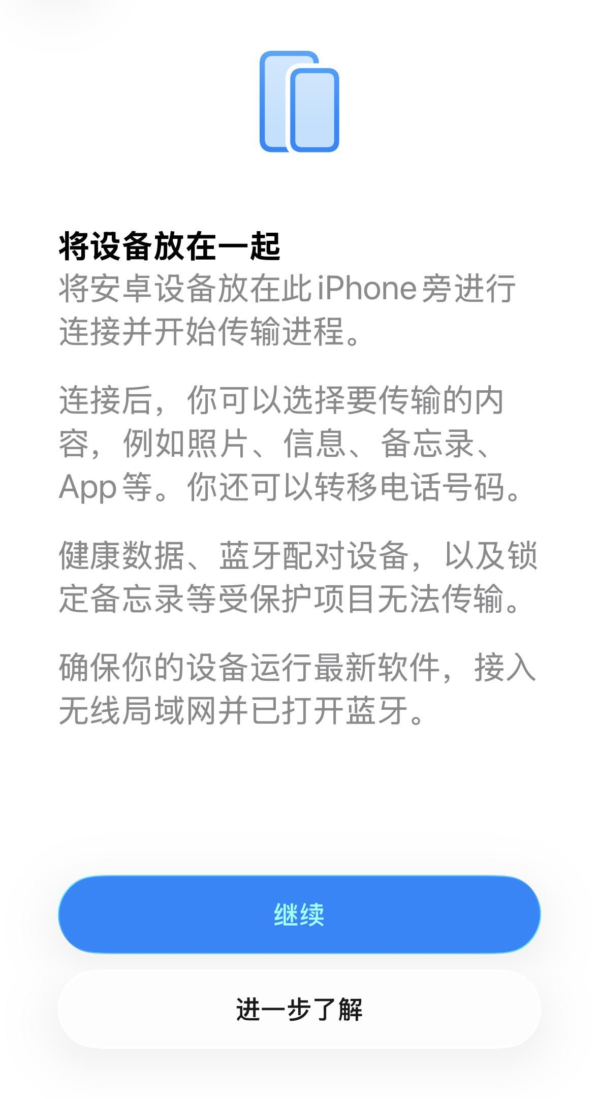 支持将数据传输至安卓设备,例如照片、信息、备忘录、App等。(设置→通用→传输或还原 iPhone→传输至安卓)