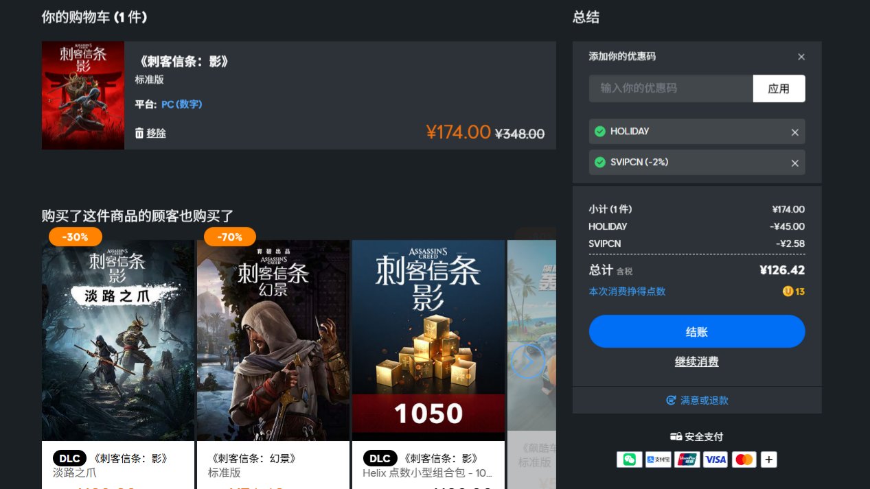 育碧冬促来了,本次促销绝对是近两年力度最大的活动!结账时,输入 HOLIDAY,单笔满 ¥88 的订单可享受一次 ¥45 减免的优惠。再输入国区专属码 SVIPCN,可再享 2% 优惠!(这个码仅在网页端使用,推荐大家在育碧网页端购买)