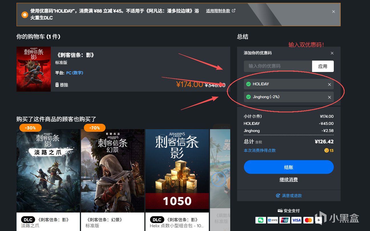 选完《刺客信条:幻景》以后,结算时输入【HOLIDAY】,满88即可减去45,再输入【Jinghong】,再享受额外2%折扣!