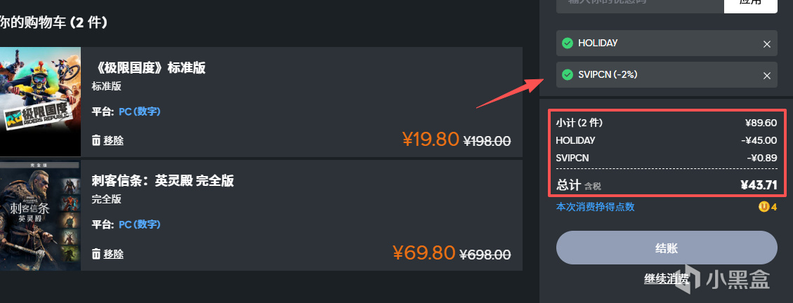 给大家举个凑单例子,《英灵殿》完全版促销后 69.8 元,低于 88 元无法使用减 45 的折扣码,但是我们可以凑个《极限国度》标准版,这样 (69.8+19.8-45)*0.98= 43.7 元 《刺客信条:英灵殿》完全版直接价格腰斩!