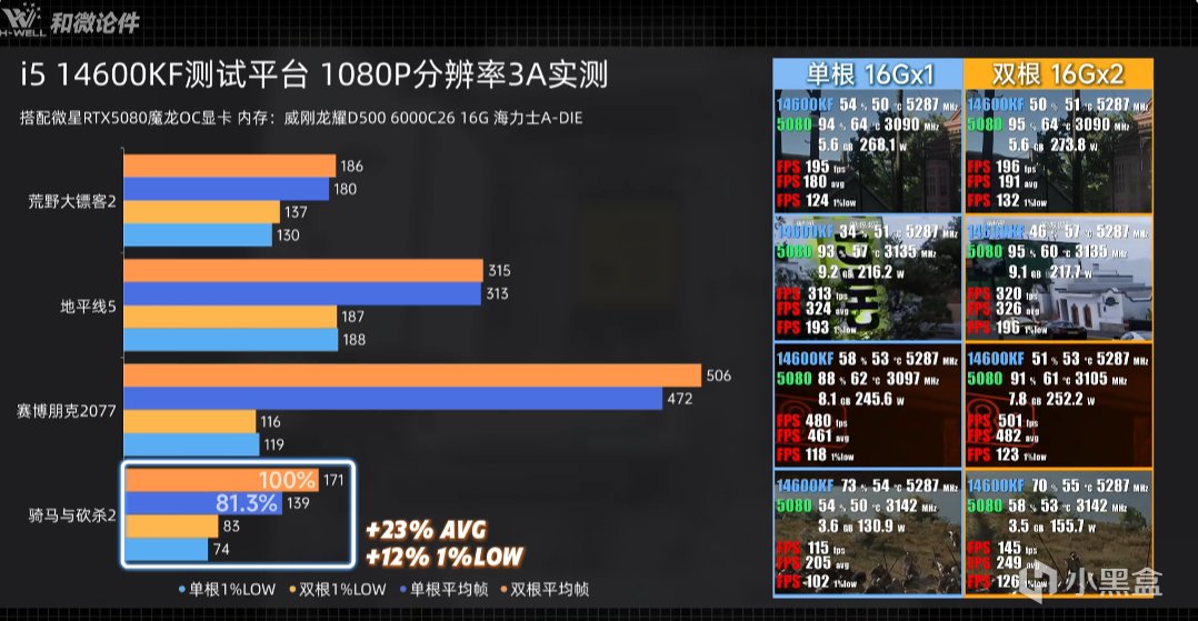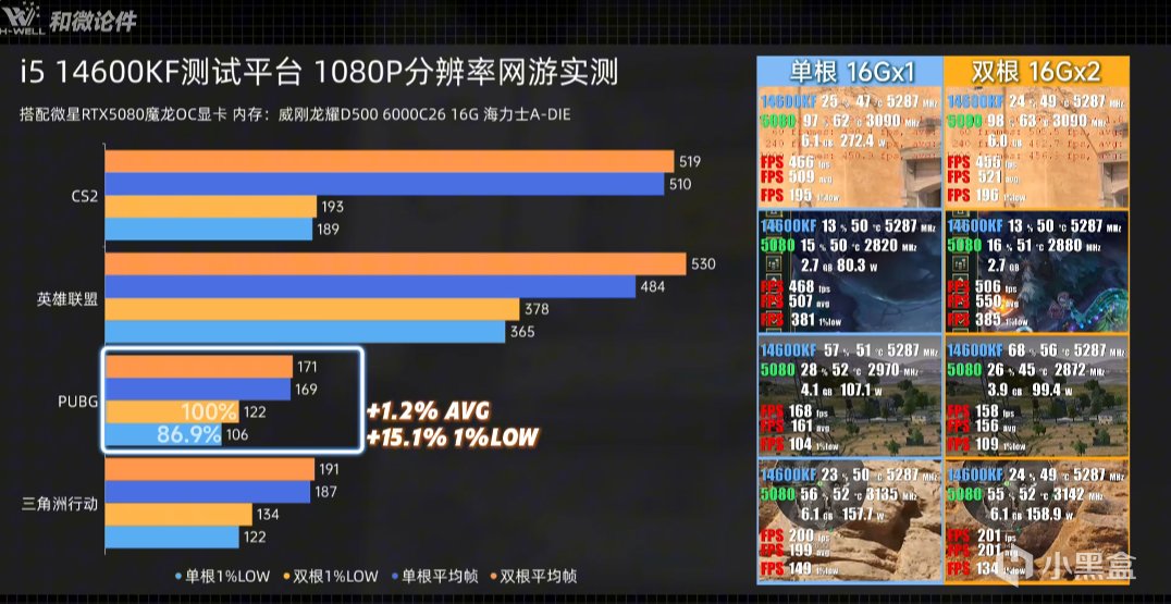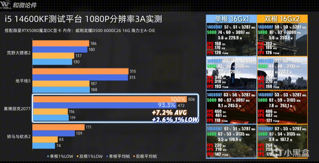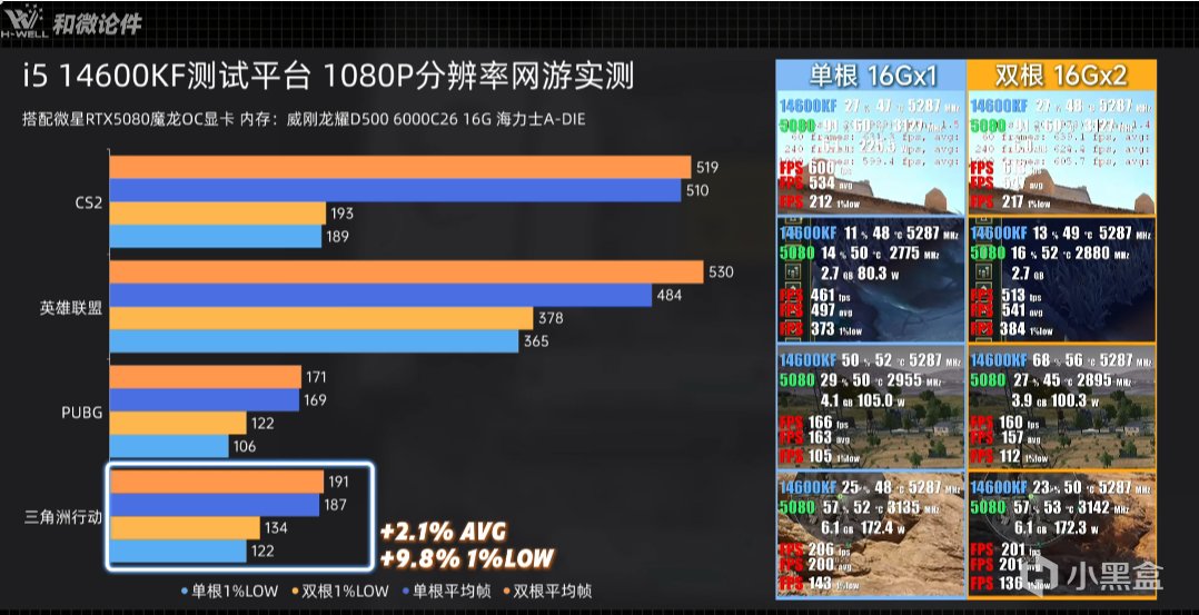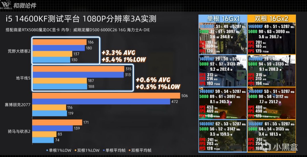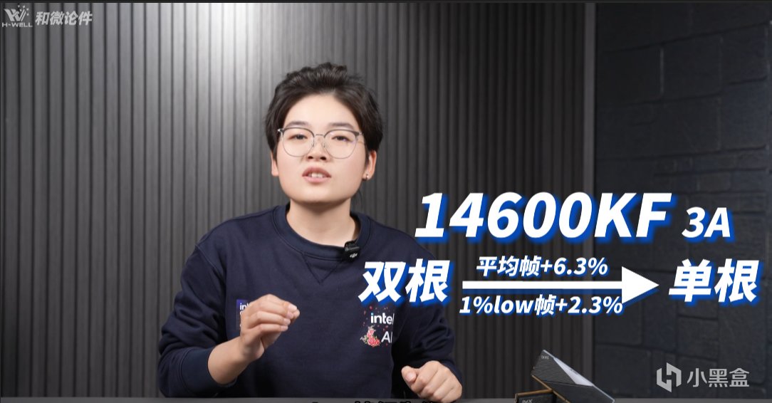 14600KF平台上,网游中双根平均帧领先约4.3%,1%low帧领先约5.4%;3A游戏中,双根平均帧领先约6.3%,1%low帧领先约2.3%。
