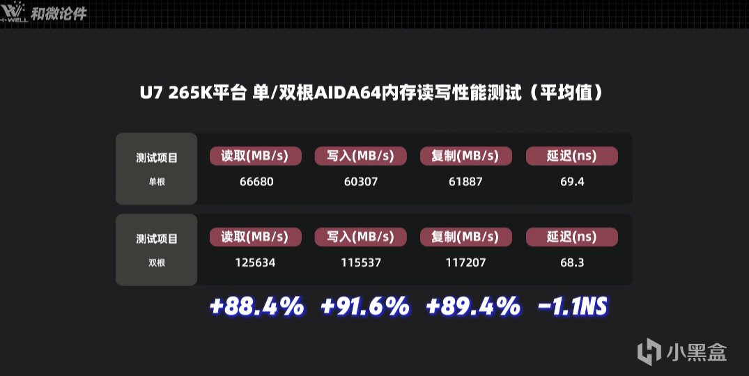 265K平台,单根读写、复制延迟平均值分别为66680MB/S,60307MB/S,61887MB/S及69.4NS,双根读写、复制延迟平均值则高达122.69GB/S,112.83GB/S,114.46GB/S及68.3NS;双根内存较单根读取涨幅约为88.4%,写入涨幅约为91.6%,复制涨幅约为89.4%,延迟降低1.1NS。