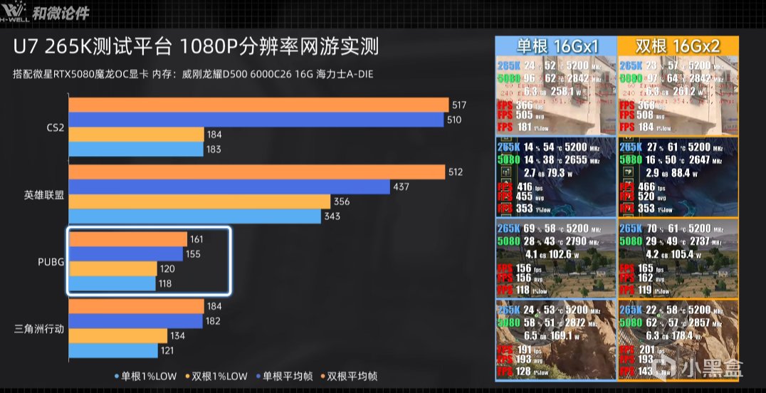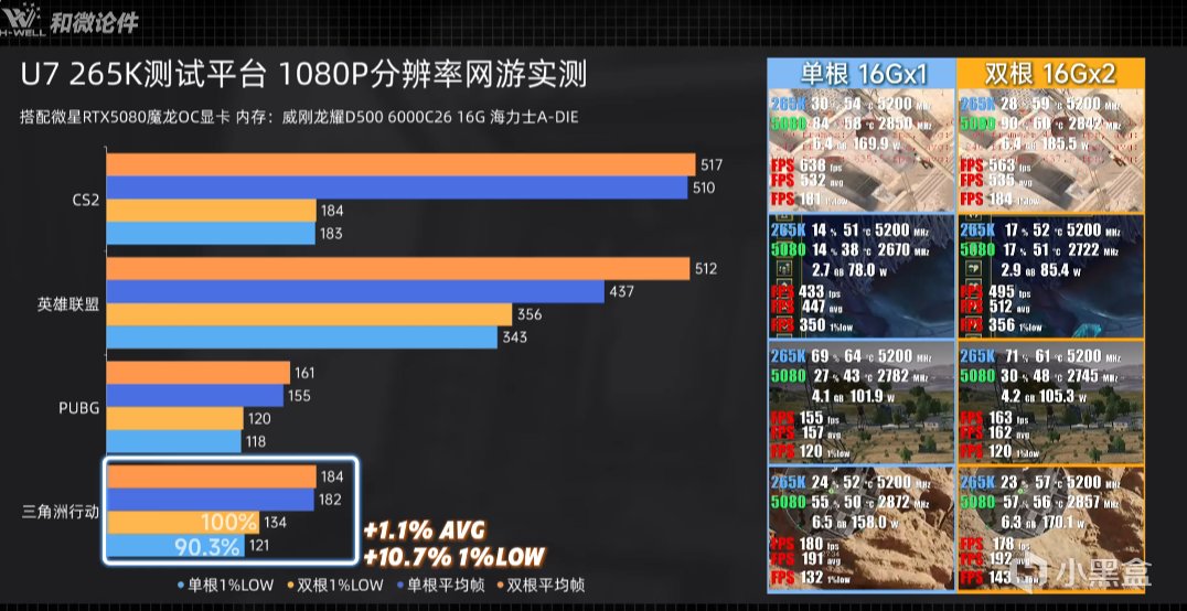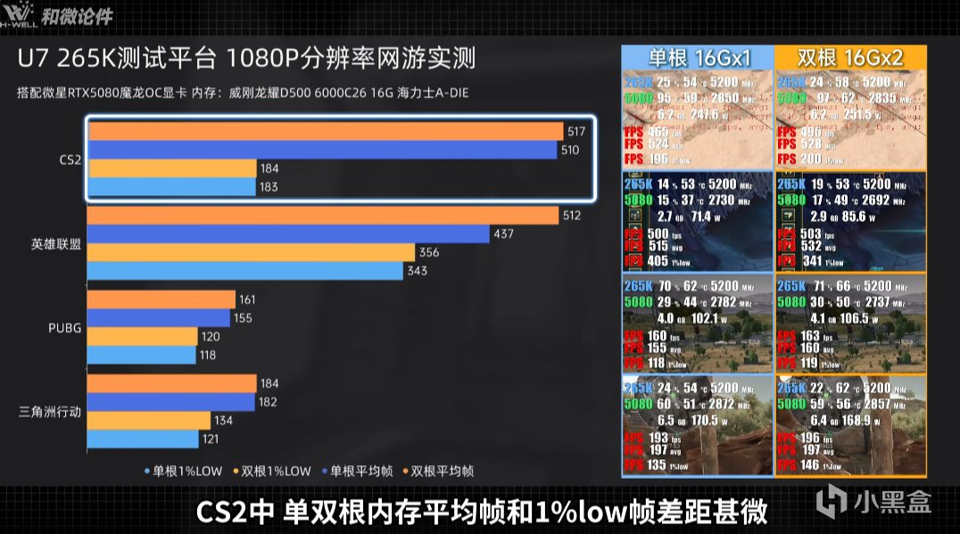首先是265K测试平台,网游部分,CS2中单双根内存平均帧和1%low帧差距甚微,分别为0.5%和1.3%;