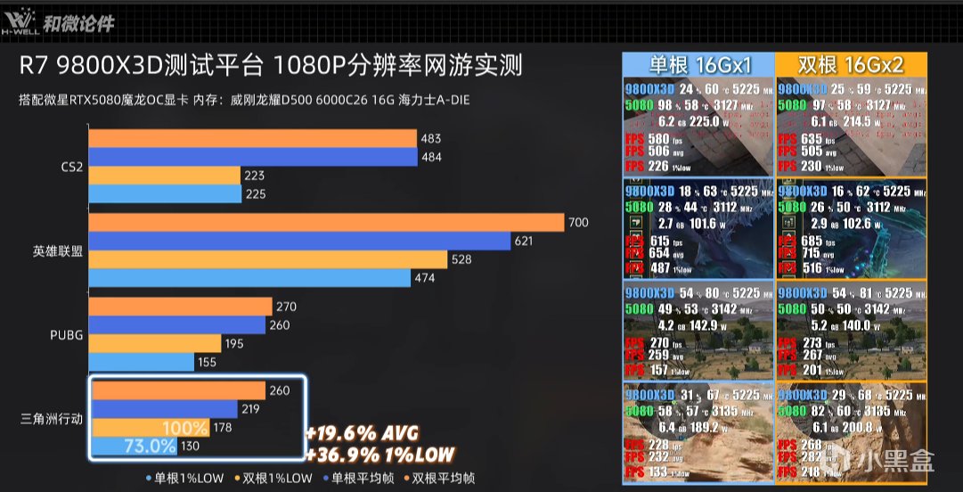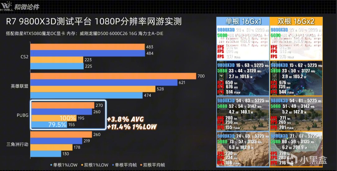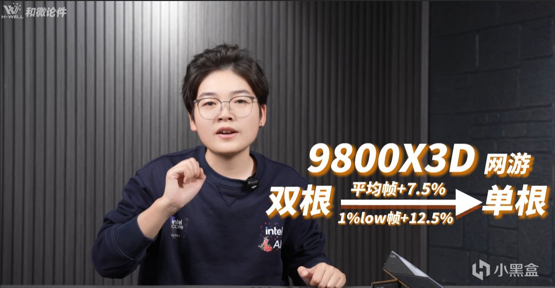 最后是9800X3D平台,网游中双根平均帧领先约7.5%,1%low帧领先约12.5%;3A游戏中,双根平均帧领先约2.3%,1%low帧领先约5.1%。