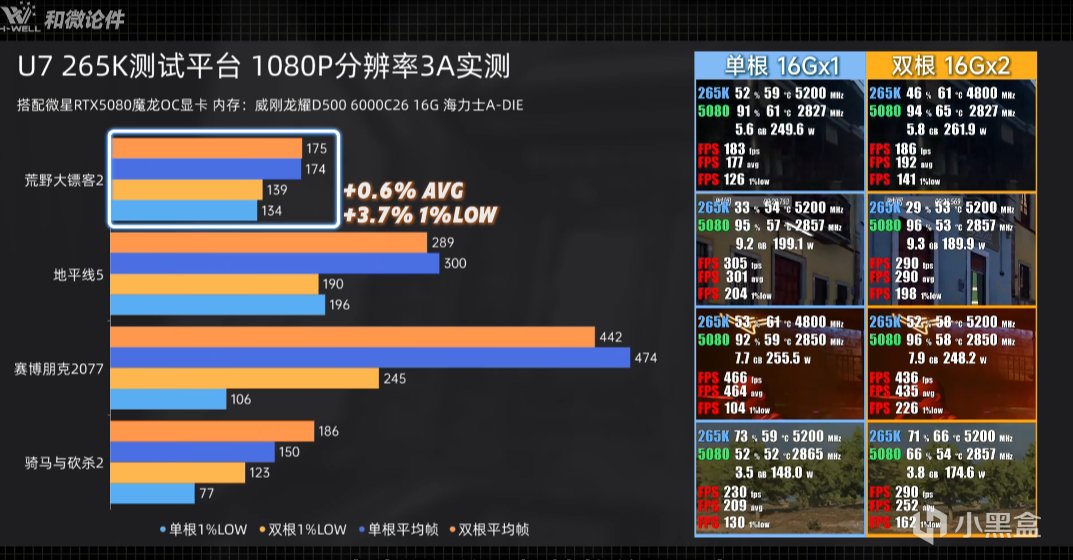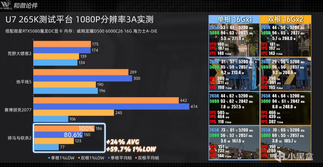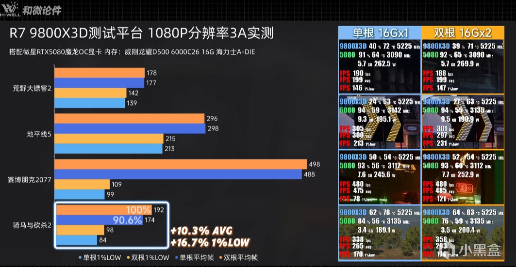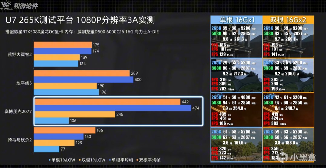再看下不怎么吃U和内存的3A游戏,大部分单双根内存帧数差异基本可以视为误差,但骑砍2中单双根内存差异较大,单根平均帧约为双根的90.6%,单根1%low跑到双根的85.7%,98X3D缓存优势虽大但核心数有限,在多线程游戏里受单双根内存差异影响依旧明显。同样的差距也体现在赛博朋克2077的1%low帧上,单根跑到双根90.8%的帧数。