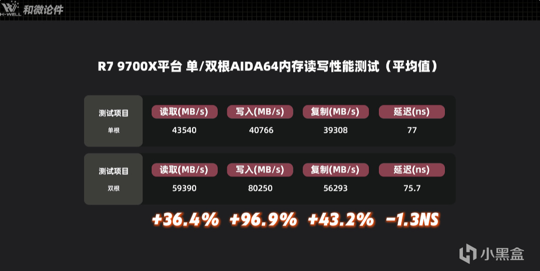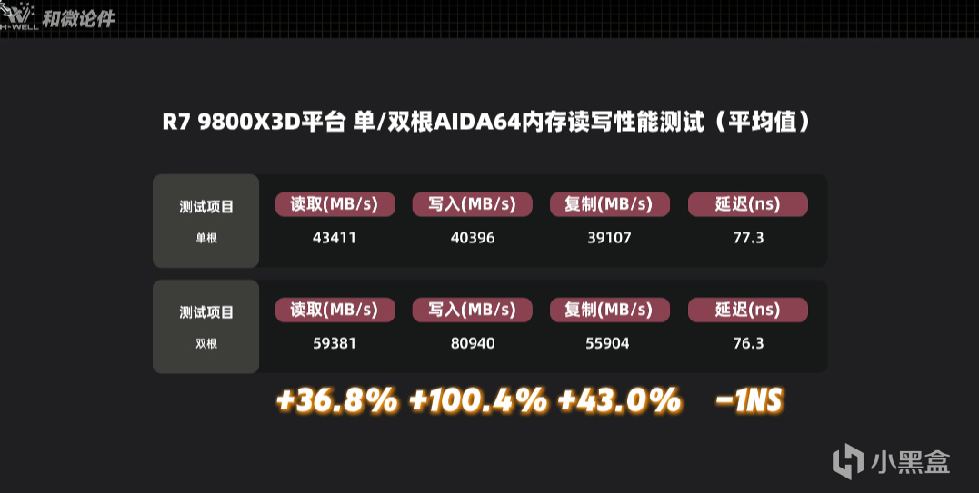 到AMD这边,我们可以看到9700X平台双根较单根读取提升约36.4%,写入涨幅约为96.9%,复制提升仅约43.2%,延迟仅降低1.3NS;9800X3D这里双根较单根读取提升约36.8%,写入性能直接翻倍,复制涨幅同样约为43.0%,延迟降低1NS。