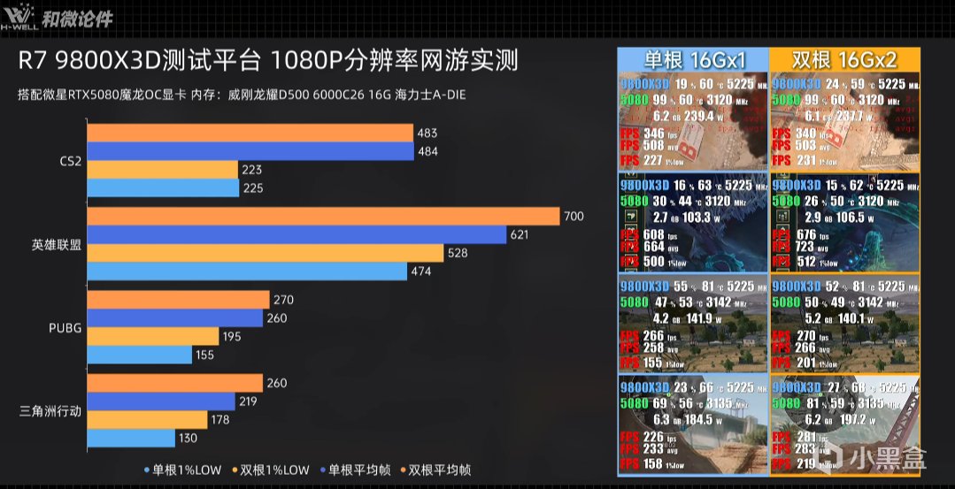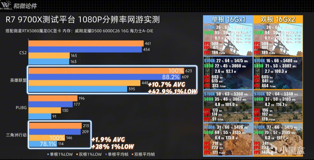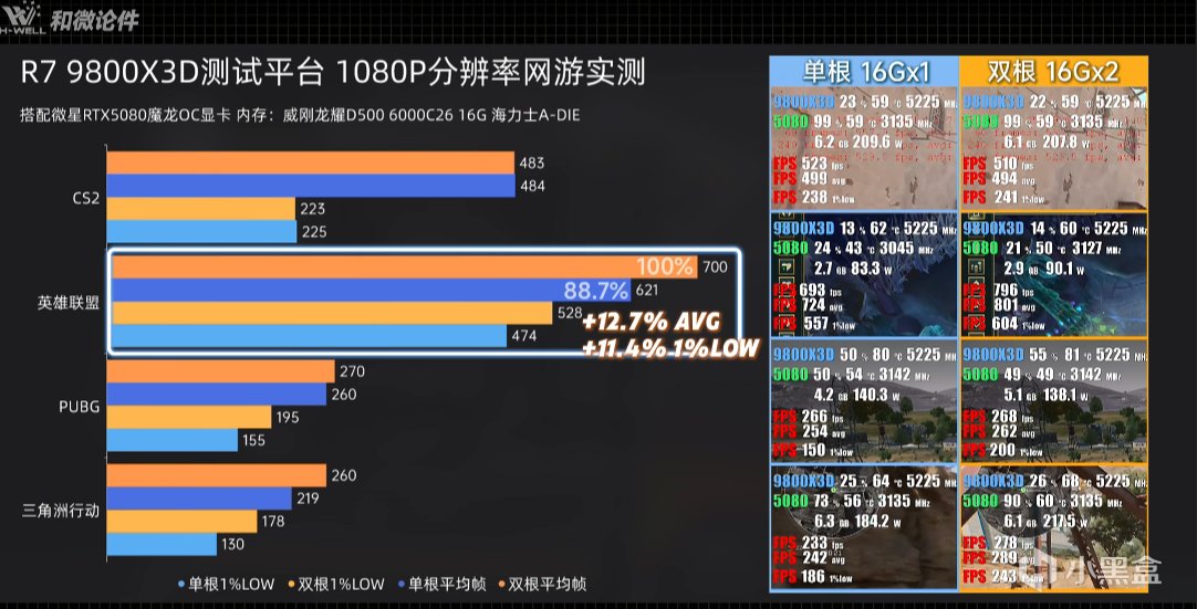 最后一个测试平台是游戏界一U之下的98X3D。理论上来说,X3D系列CPU的大三缓可以替代部分内存功能,缓解内存瓶颈,因此受内存差异影响较小,实际情况是不是这样呢?让我们来看下具体游戏表现:英雄联盟测试中,单根跑到了双根平均帧的88.7%,1%low帧则达到了89.8%;