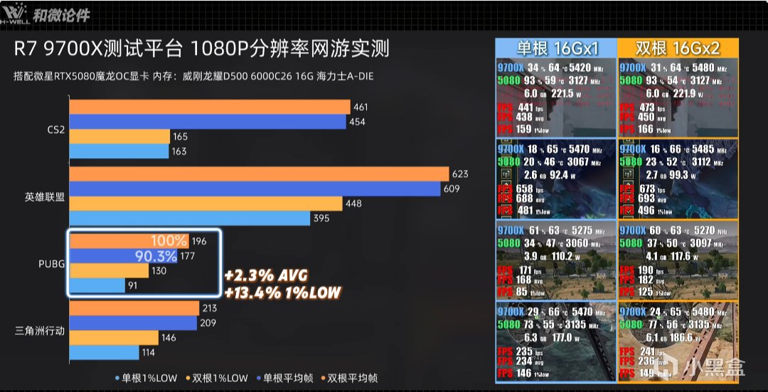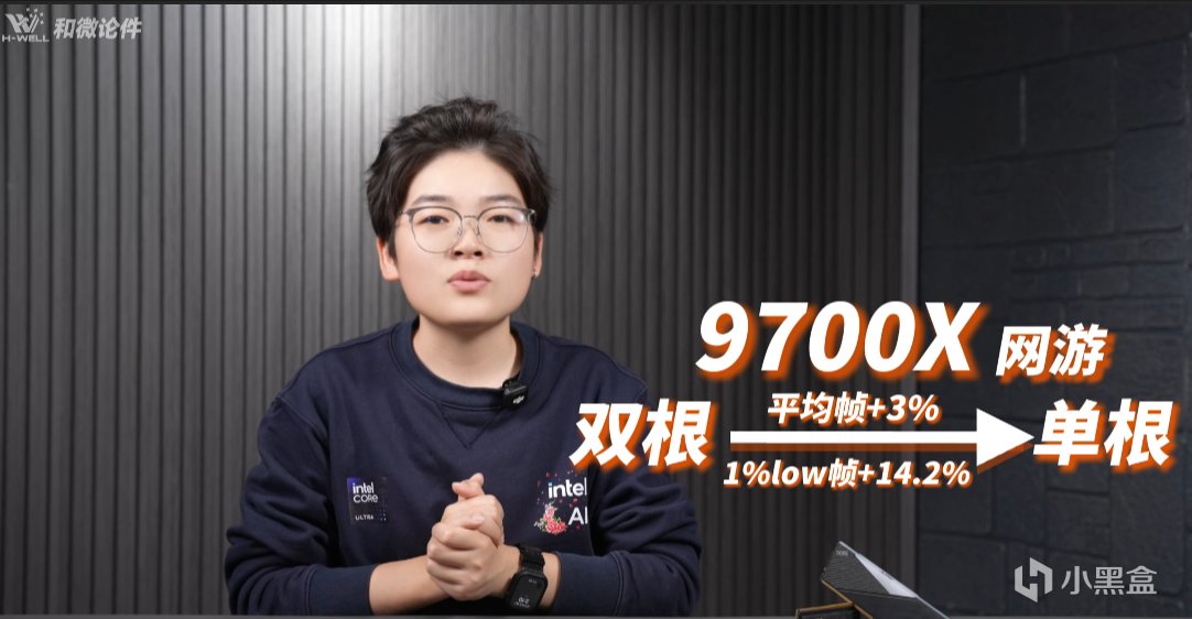 再看9700X,网游中双根平均帧领先约3%,1%low帧领先约14.2%;3A游戏中,双根平均帧领先约4.8%,1%low帧领先约5.3%。