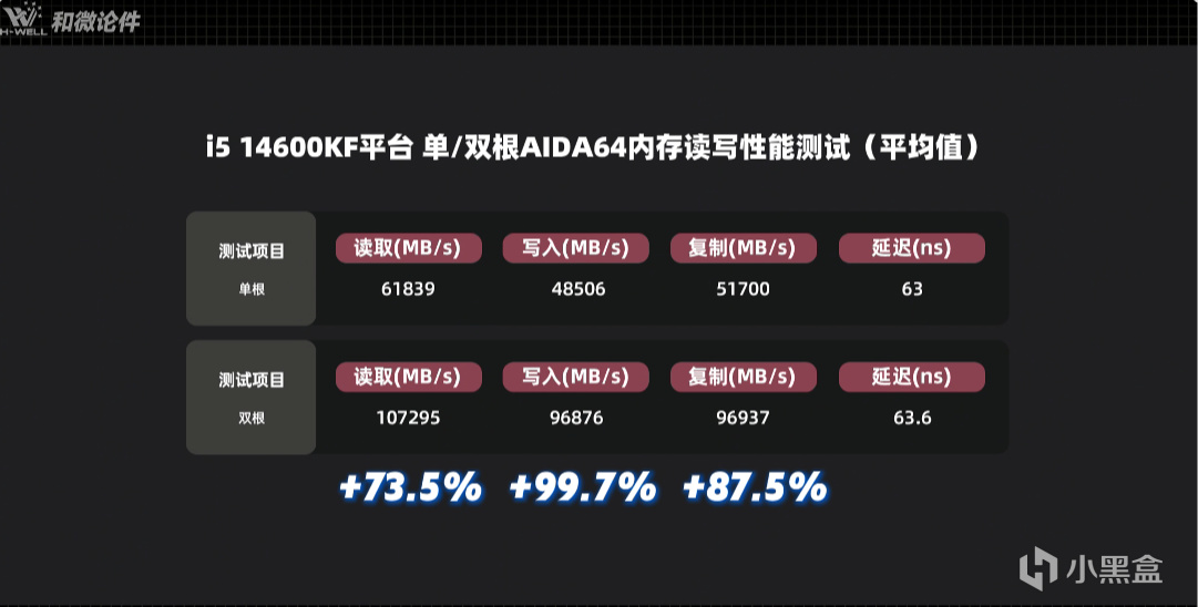 再看14600KF平台,单根读写、复制延迟平均值分别为61839MB/S,48506MB/S,51700MB/S及63ns,双根读写、复制延迟平均值分别为107295MB/S,96876MB/S,96937MB/S及63.6NS;双根内存较单根读取涨幅约为73.5%,写入差距高达约99.7%,复制涨幅约为87.5%,延迟高了0.6NS。
