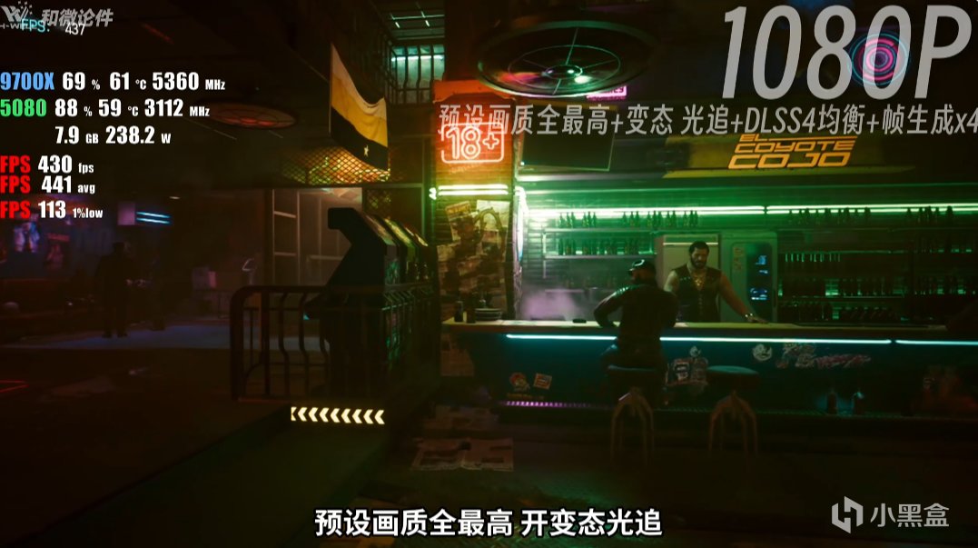 赛博朋克2077预设画质全最高,开变态光追,DLSS4均衡+4倍补针;