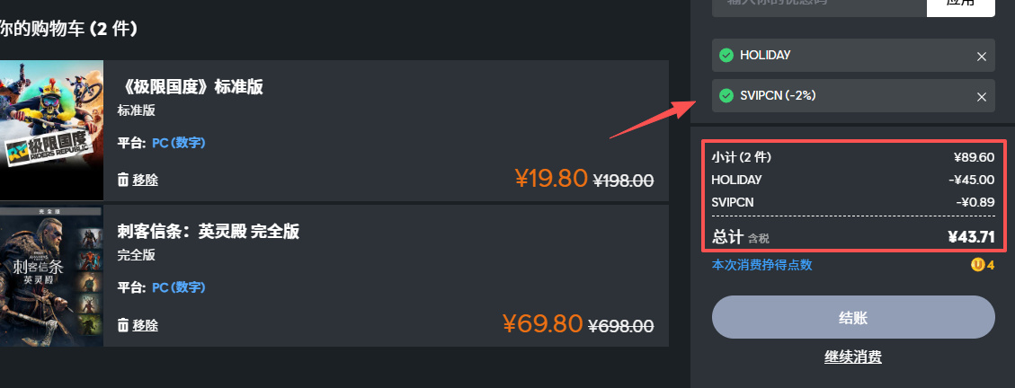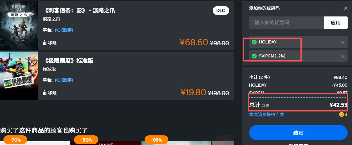 首先大家最關心的就是《刺客信條:影》DLC 參加本次活動嗎?答案是 YES!冬促 68.6 元,再加個 20 元的遊戲,使用兩個折扣碼,低至 42.53 元: