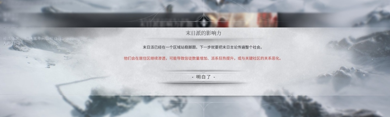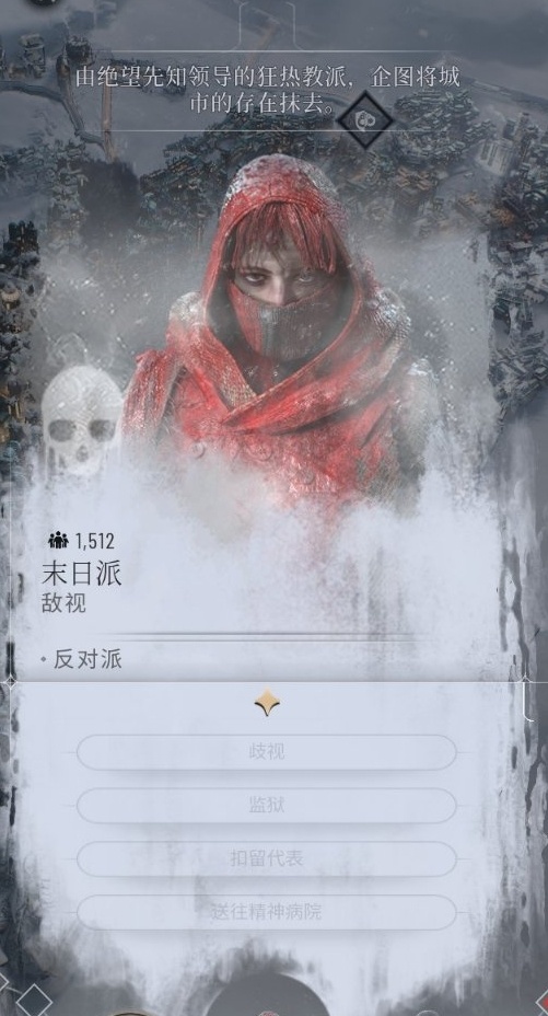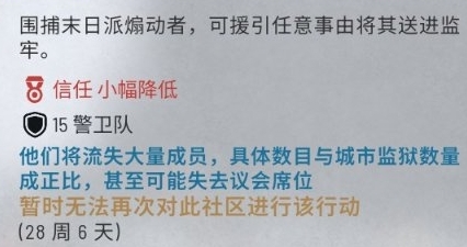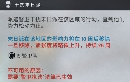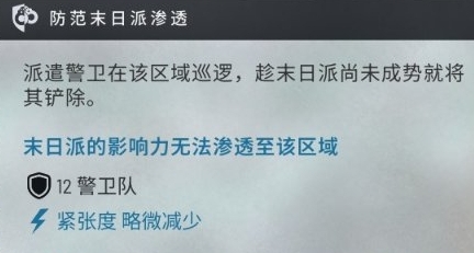 末日派有可能擴散到其他區域並且開始聚會來吸引人加入末日派(居住區),該居住區的派系會定期在末日派的作用下降低好感,並且城市緊張度會提升。