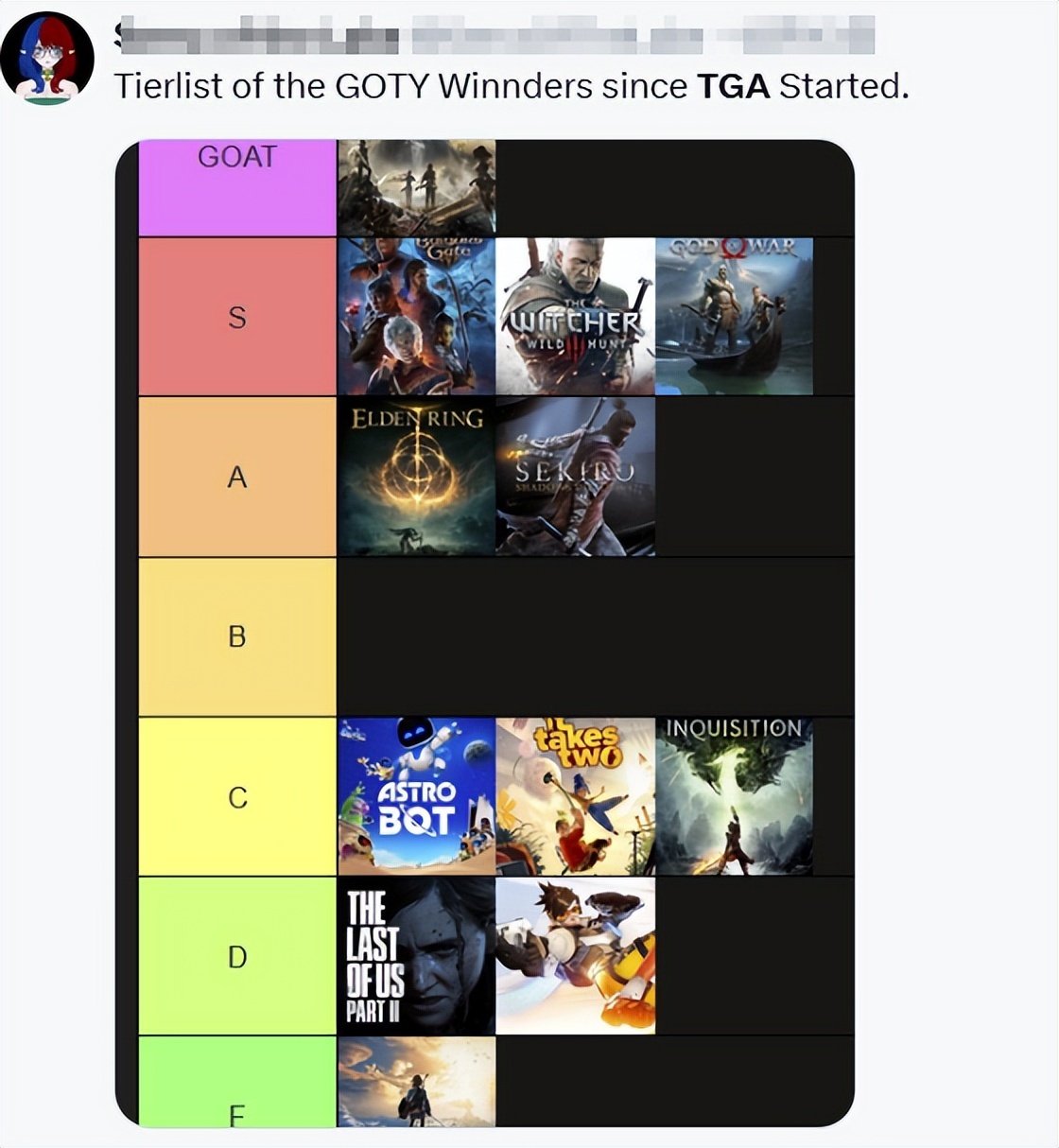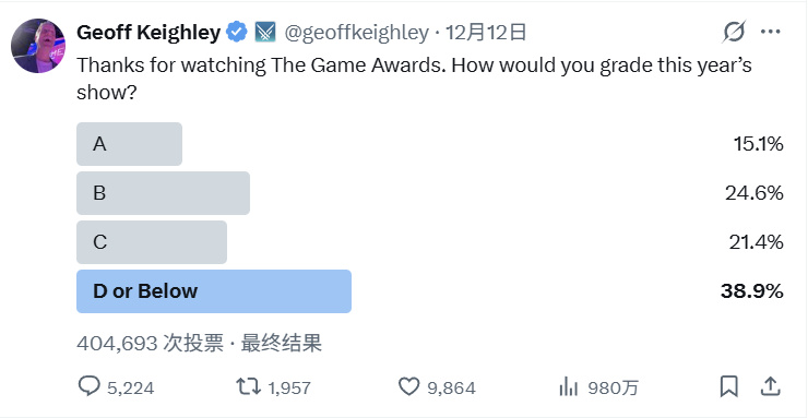 受此影响,当杰夫像往年一样,在X上发布对本届TGA的满意度调查时,打出“D或更低”评价的观众高达38.9%,最高的A评级仅为15.1%——要知道,同样因年度归属而争议极大的去年TGA,其“差评率”仅有14.9%,“好评率”则高达46.8%……