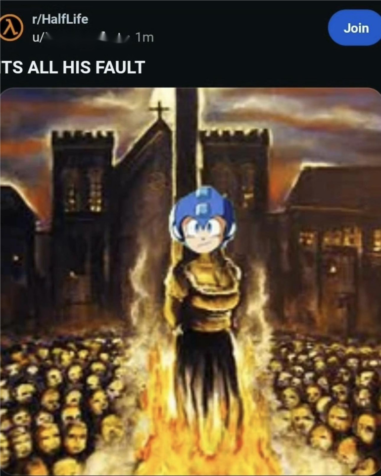 很快,人们开始像黑死病爆发时的教廷和国王那样,为一切的癫狂寻找一个替罪羊——最终,他们找到了刚刚在TGA上公布的《洛克人 双重超载》,将这个射黄豆的蓝色故障机器人指定为一切的元凶,并将他送上了火刑架,施以柳条人红温火烤之刑,行圣女贞德与布鲁诺故事。