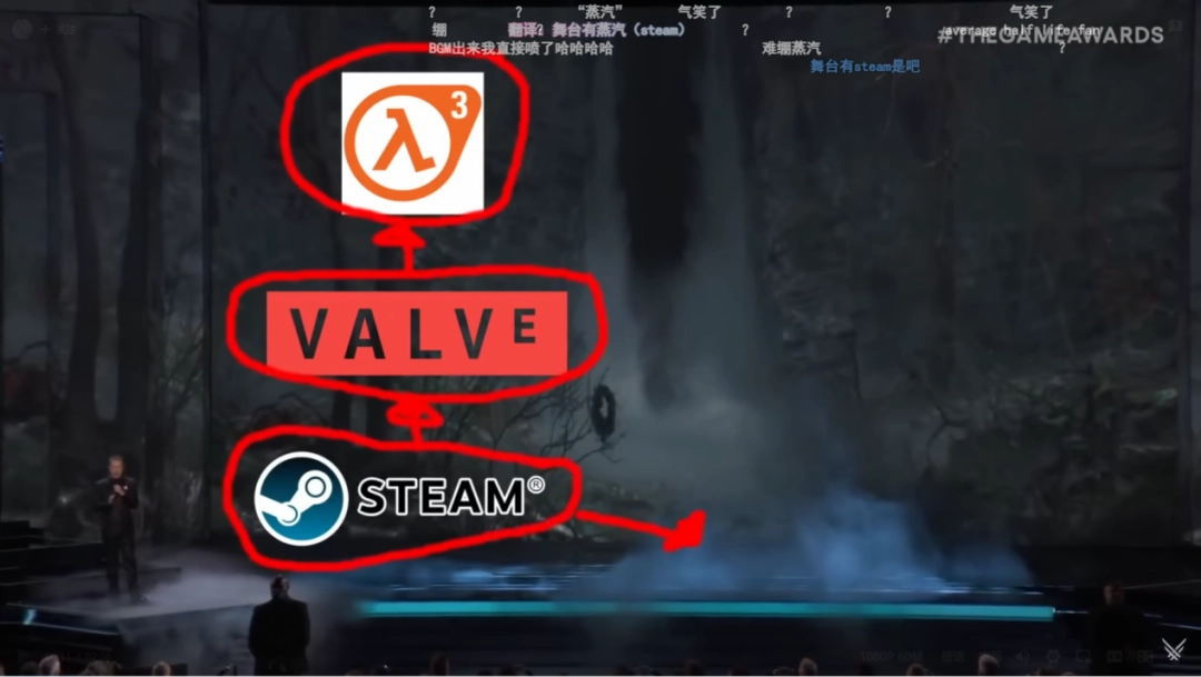 前三小时,没有任何事情发生。这很正常,《半条命3》这么重量级的嘉宾不该草草亮相,可越是等待越是焦急——终于,到了宣布年度游戏前的最后一轮播片……就在这时,杰夫忽然开口了。