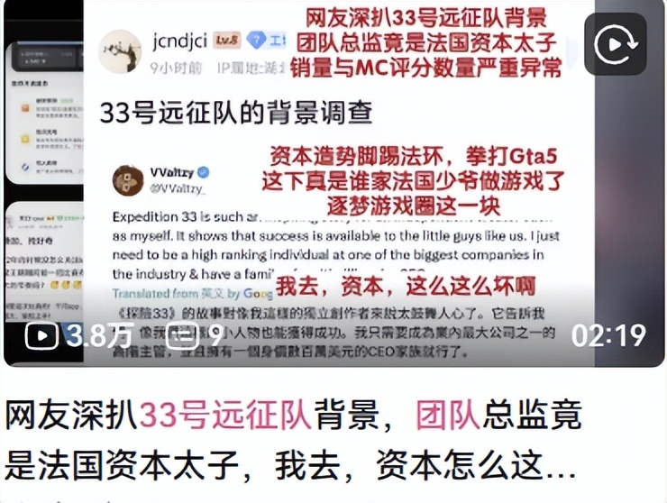 各类所谓的“深扒”“背景调查”,也在获奖后的第一时间涌现而出,有人宣称《光与影:33号远征队》的创意总价是法国资本太子,手握五家巨头公司的控制权,杰夫和TGA都是受到裹挟操控才被迫向资本献媚“造神”;更有人宣称,《光与影:33号远征队》获奖背后其实是神秘组织共济会在背后发力,因为游戏开发团队33人(虽然有猫),游戏名称叫“33”,远征队叫“33”,游戏里还有三角形,因此暗合了三位一体和全视之眼……