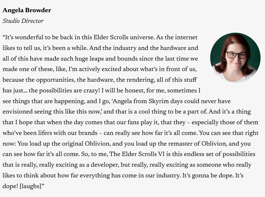 埃米尔则提到硬件技术进步为开发带来新可能,称"作为开发者,《上古卷轴6》蕴含的无限可能性令人振奋"。
