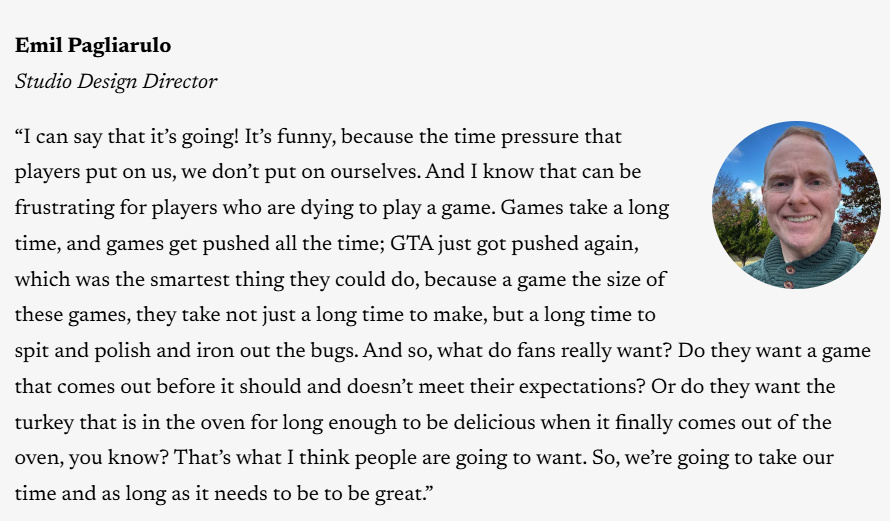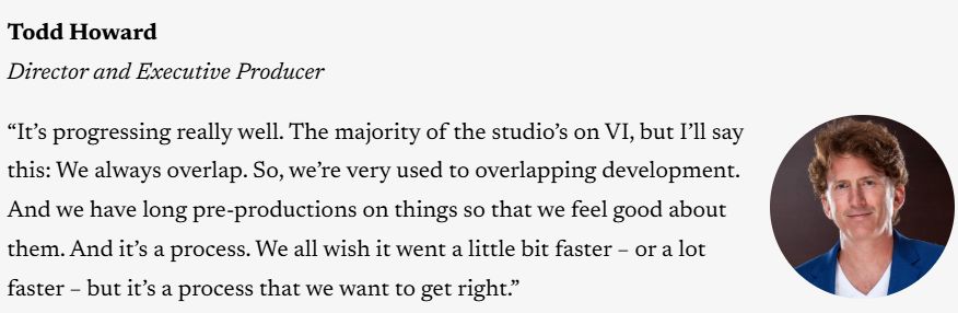 陶德补充道:"大部分团队正专注于第六代开发,但我们习惯多项目并行推进。虽然希望进度更快,但质量优先始终是我们的准则。"