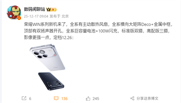 快科技12月17日消息,榮耀WIN系列今天正式官宣定檔,將於12月26日正式發佈。