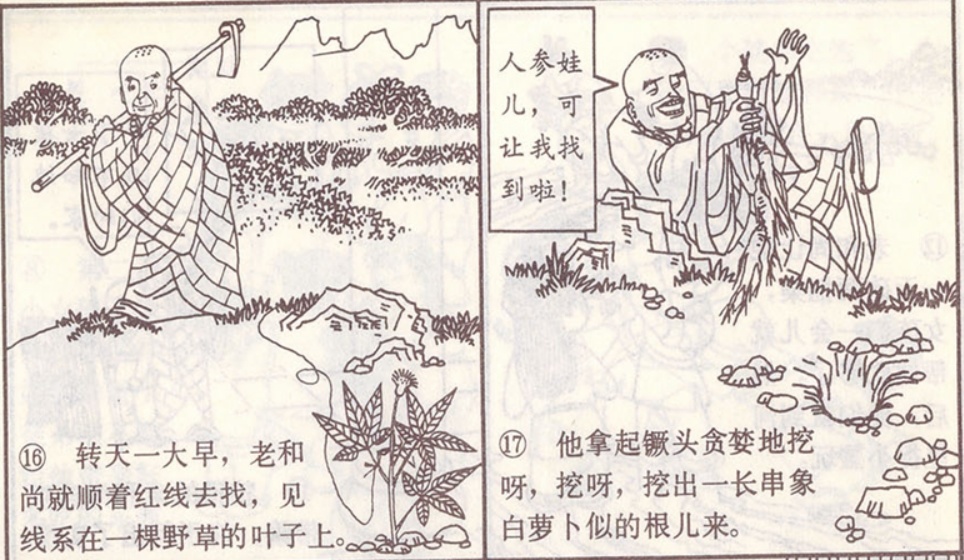 小时候对这篇连环画的印象是小和尚在河边与小伙伴们捉螃蟹、老和尚顺着红线见到的人参茎叶。