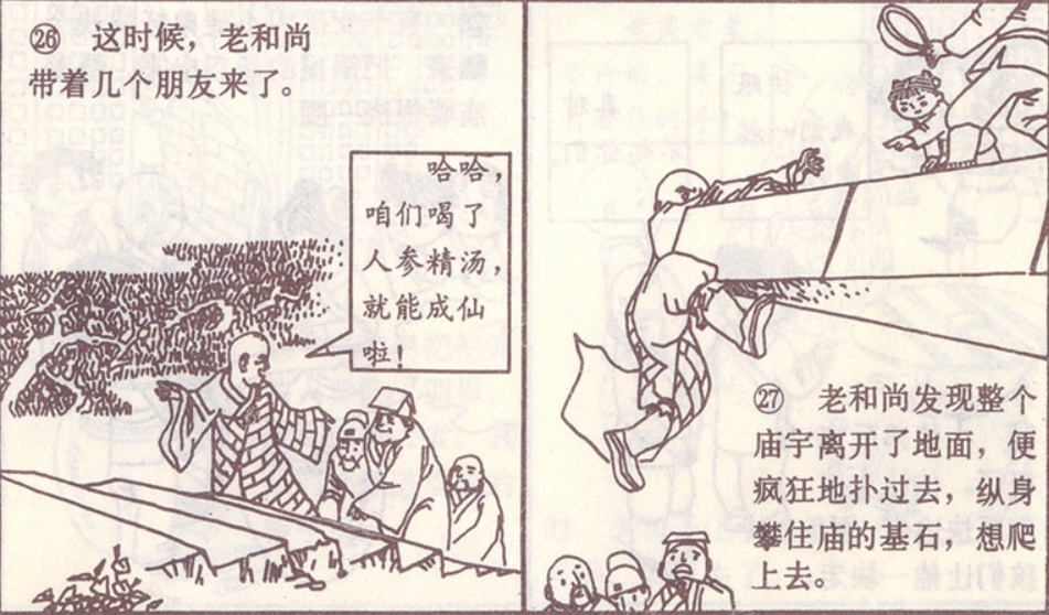 这时候,老和尚带着几个朋友来了。他一边邀请一边说道:哈哈,咱们喝了人参精汤,就能成仙啦!