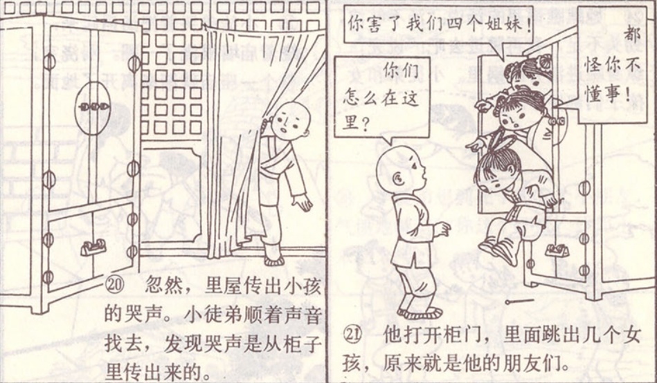 忽然,里屋传出小孩的哭声。小徒弟顺着声音找去,发现哭声是从柜子里传出来的。
