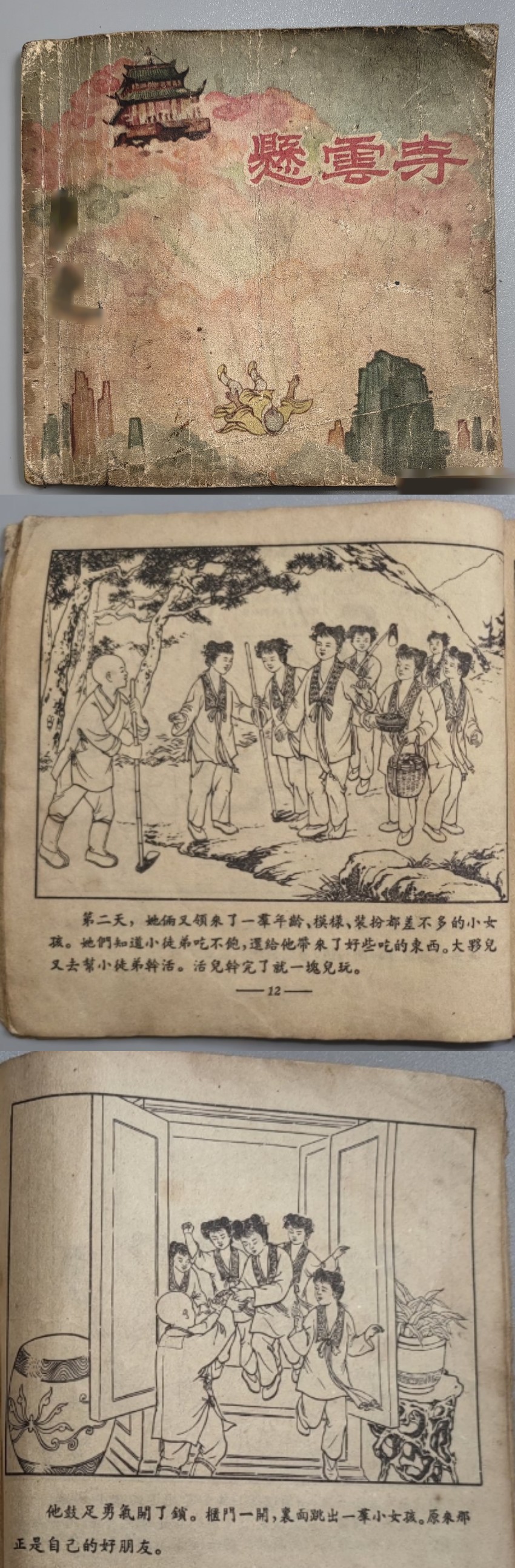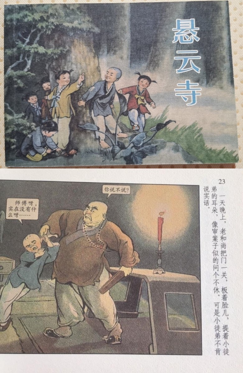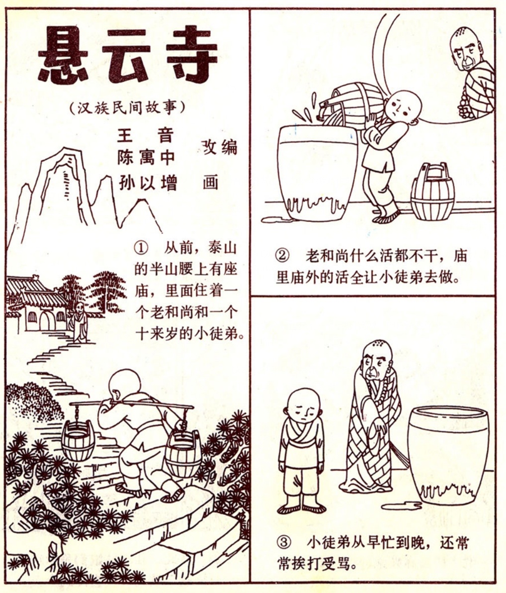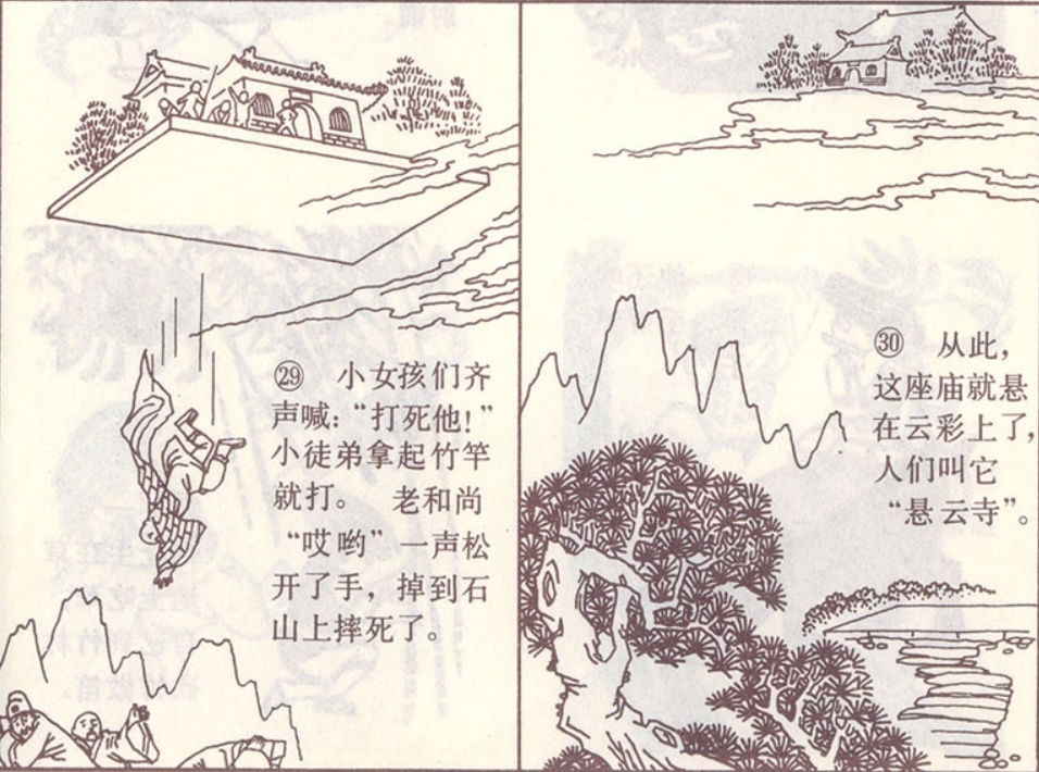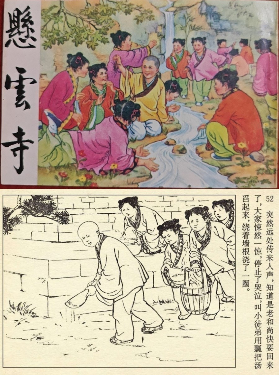 悬云寺这个故事还有两个版本的连环画,皆是由芷汀的故事为蓝本创作的。如1956年张玮绘画的和刘王斌所绘的彩色连环画。