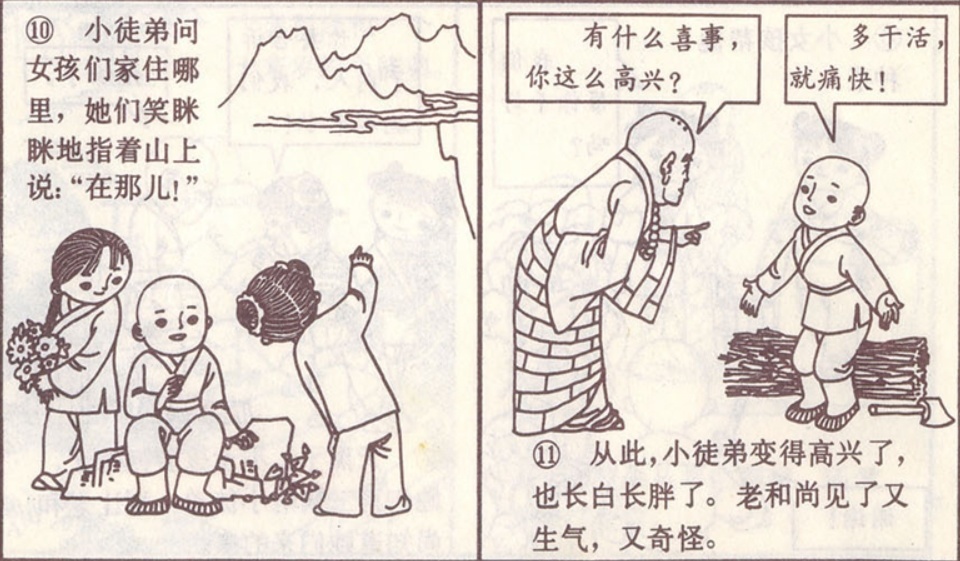 从此,小徒弟变得高兴了,也长白长胖了。老和尚见了又生气,又奇怪。问他:你有什么喜事,你这么高兴?小徒弟说,多干活就痛快!