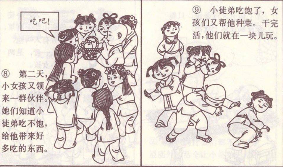 第二天小女孩又领来一群伙伴。她们知道小徒弟吃不饱,给他带来好多吃的东西。
