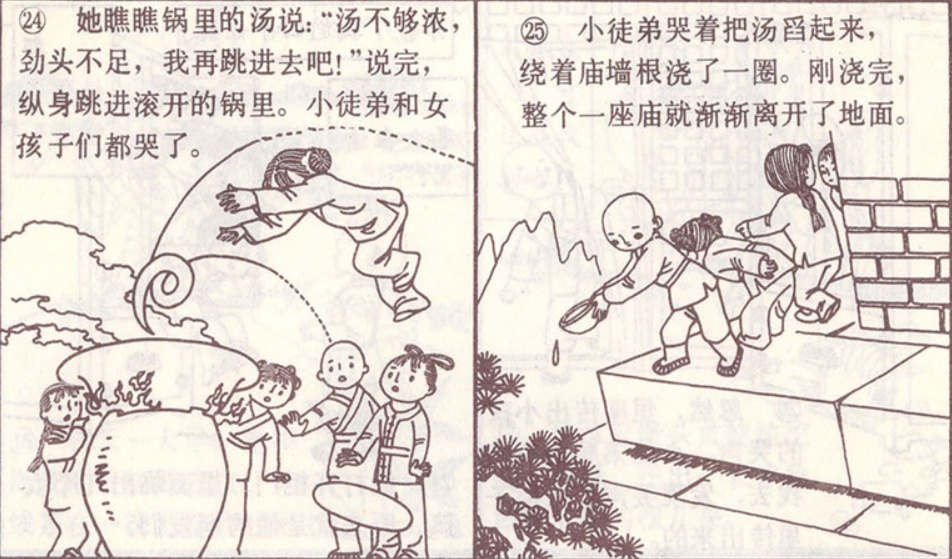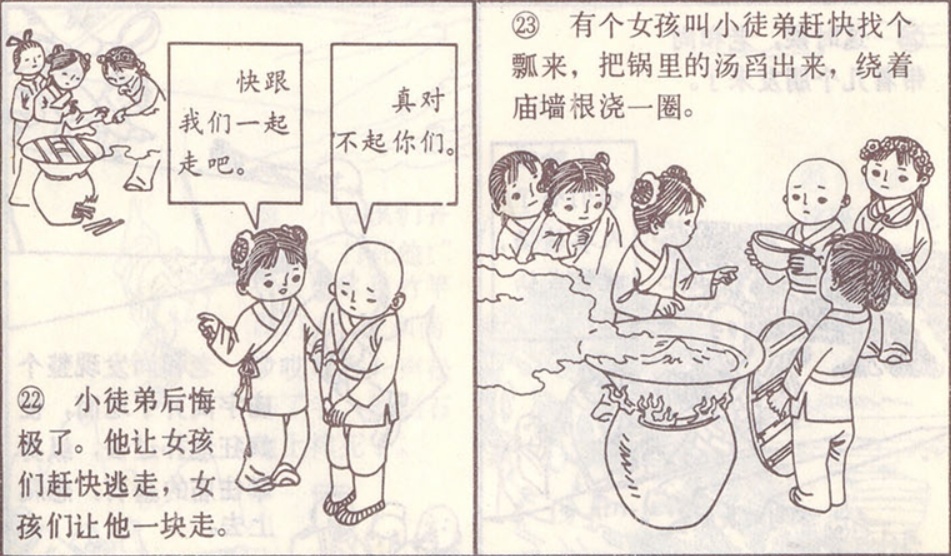 有个女孩叫小徒弟赶快找个瓢来,把锅里的汤舀出来,绕着庙墙根浇一圈。