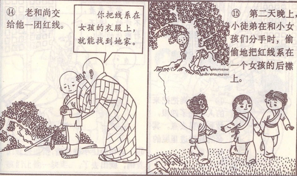 老和尚交给小徒弟一团红线。并在他耳边叮嘱道你把线系在女孩的衣服上,顺着红线就能找到她家。