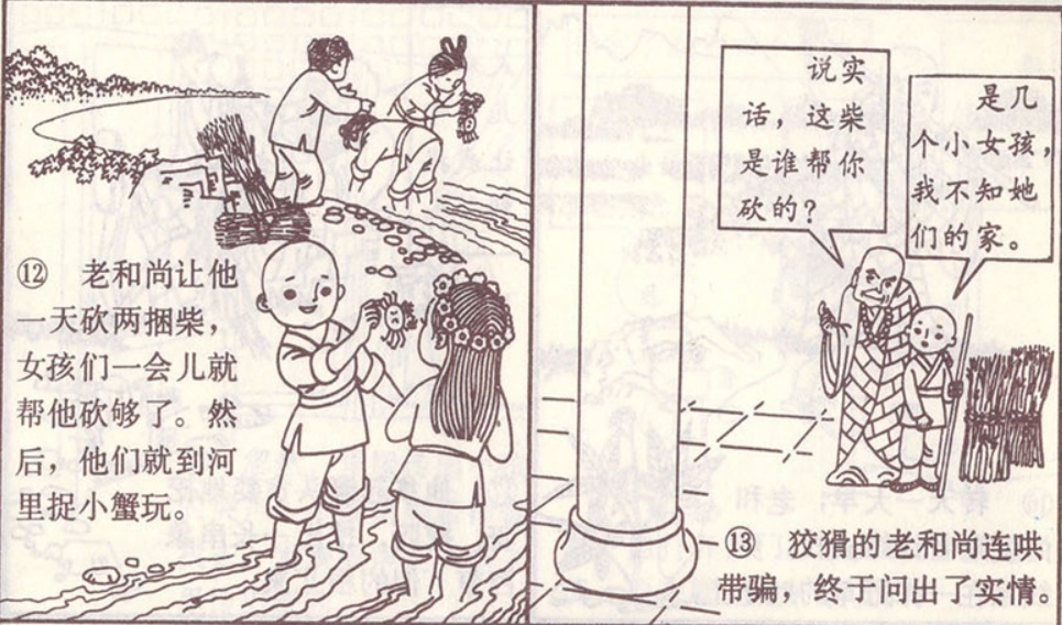 老和尚让他一天砍两捆柴,女孩们一会儿就帮他砍够了。然后,他们就到河里捉小蟹玩。